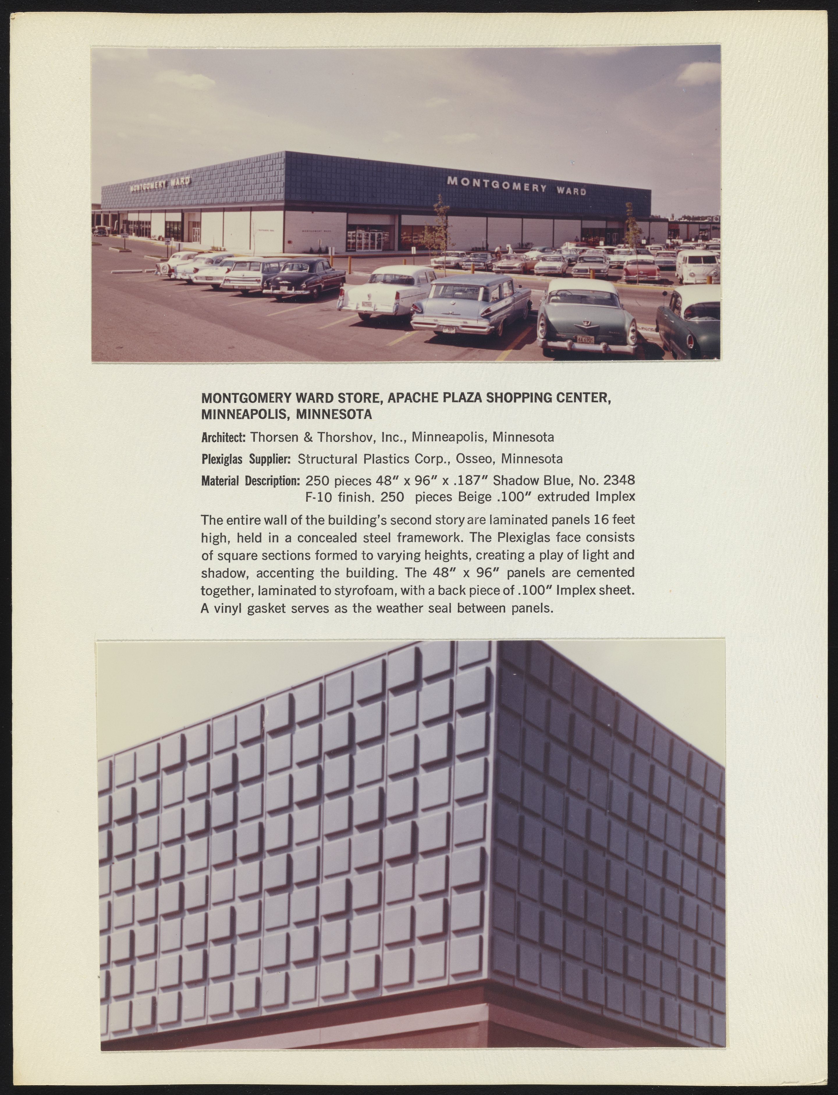 Two photographs depicting the Montgomery Ward store located at the Apache Plaza Shopping Center in Minneapolis, Minnesota, part of a series documenting the use of Plexiglas in the building industry. Per notations accompanying the photographs, the building was designed by architectural firm Thorsen & Thorshov, Inc. and features a wall of laminated Plexiglas panels held in a concealed steel framework.
