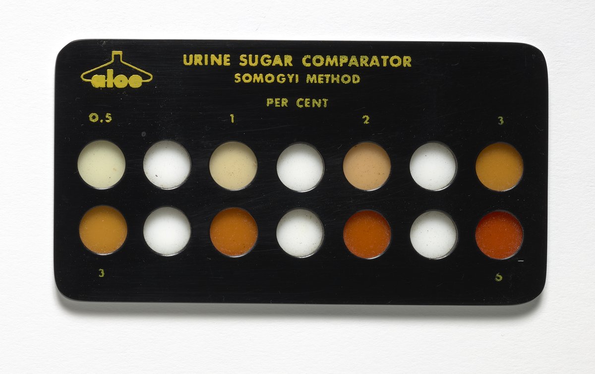 Small JPG1200 x 756px — 116 KBLarge JPG2880 x 1815px — 603 KBFull-sized JPG3946 x 2487px — 1.0 MBOriginal fileTIFF — 3946 x 2487px — 28.1 MBThis plastic comparator for the Somogyi Method Urine sugar test likely belonged to Dr. Michael Somogyi (1883-1971). Contains yellow printing with a fabric case. This screening device is used to determine glucose levels in urine, which may be an indicator of diabetes.