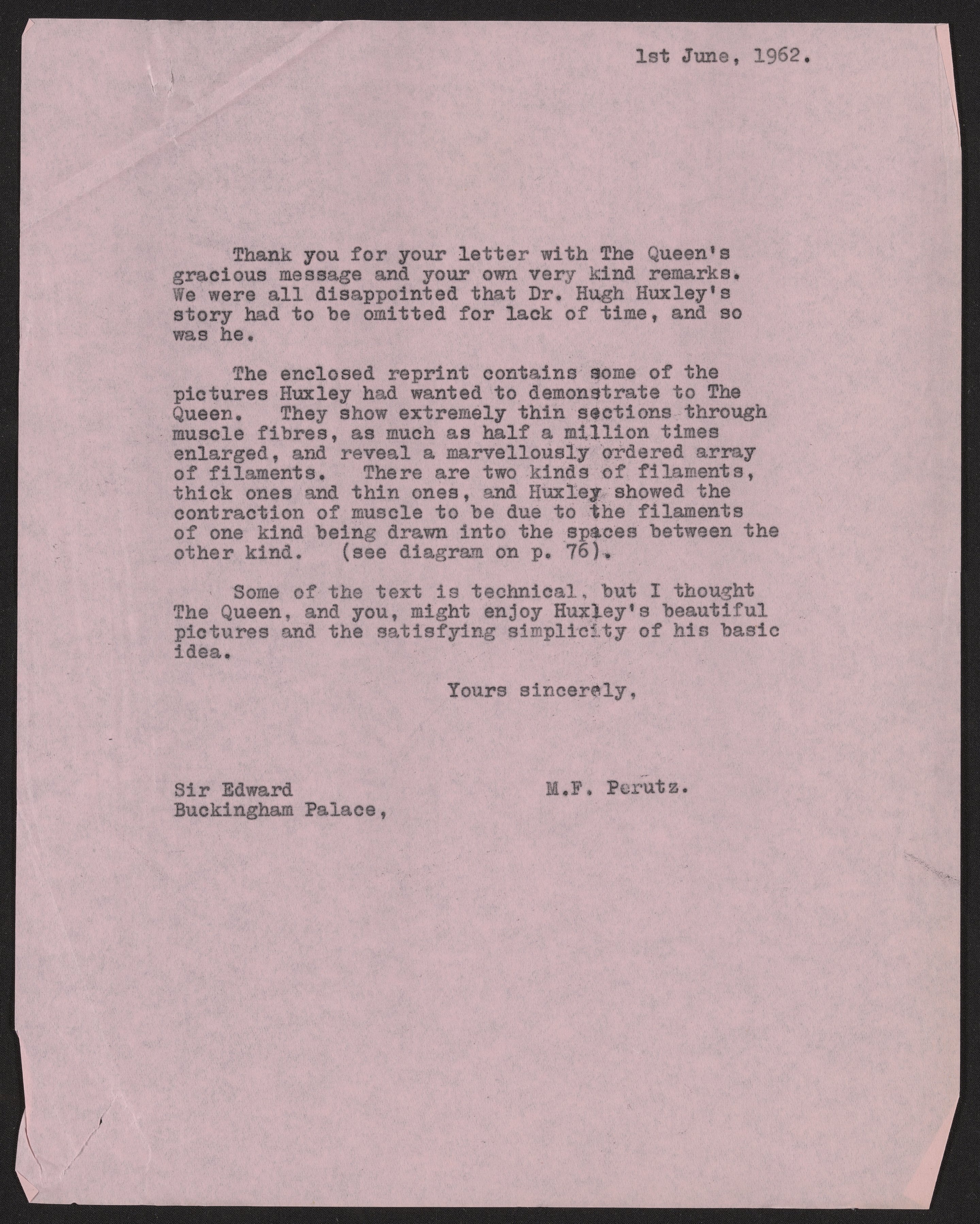 Perutz, Max F. “Letter from Max Perutz to Edward Ford, June 1, 1962,” June 1, 1962. History of Molecular Biology Collection, Box 74, Folder 4. Science History Institute. Philadelphia. https://digital.sciencehistory.org/works/rd2cykl.