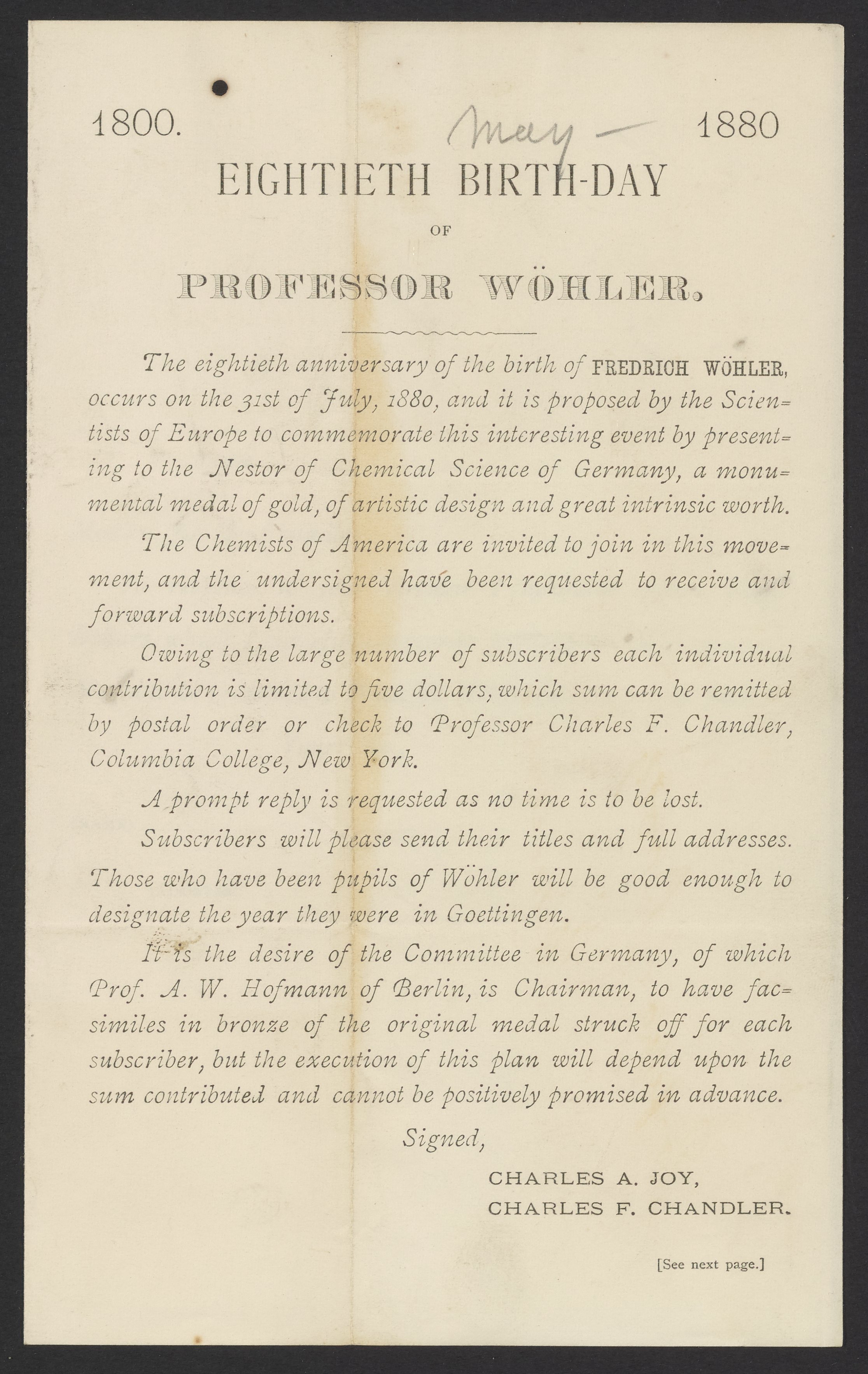 American Chemical Society. “Invitation to the Eightieth Birth-Day of Professor Wöhler,” 1880. Papers of James Curtis Booth, Box 1, Folder 4. Science History Institute. Philadelphia. https://digital.sciencehistory.org/works/rf2qek6.