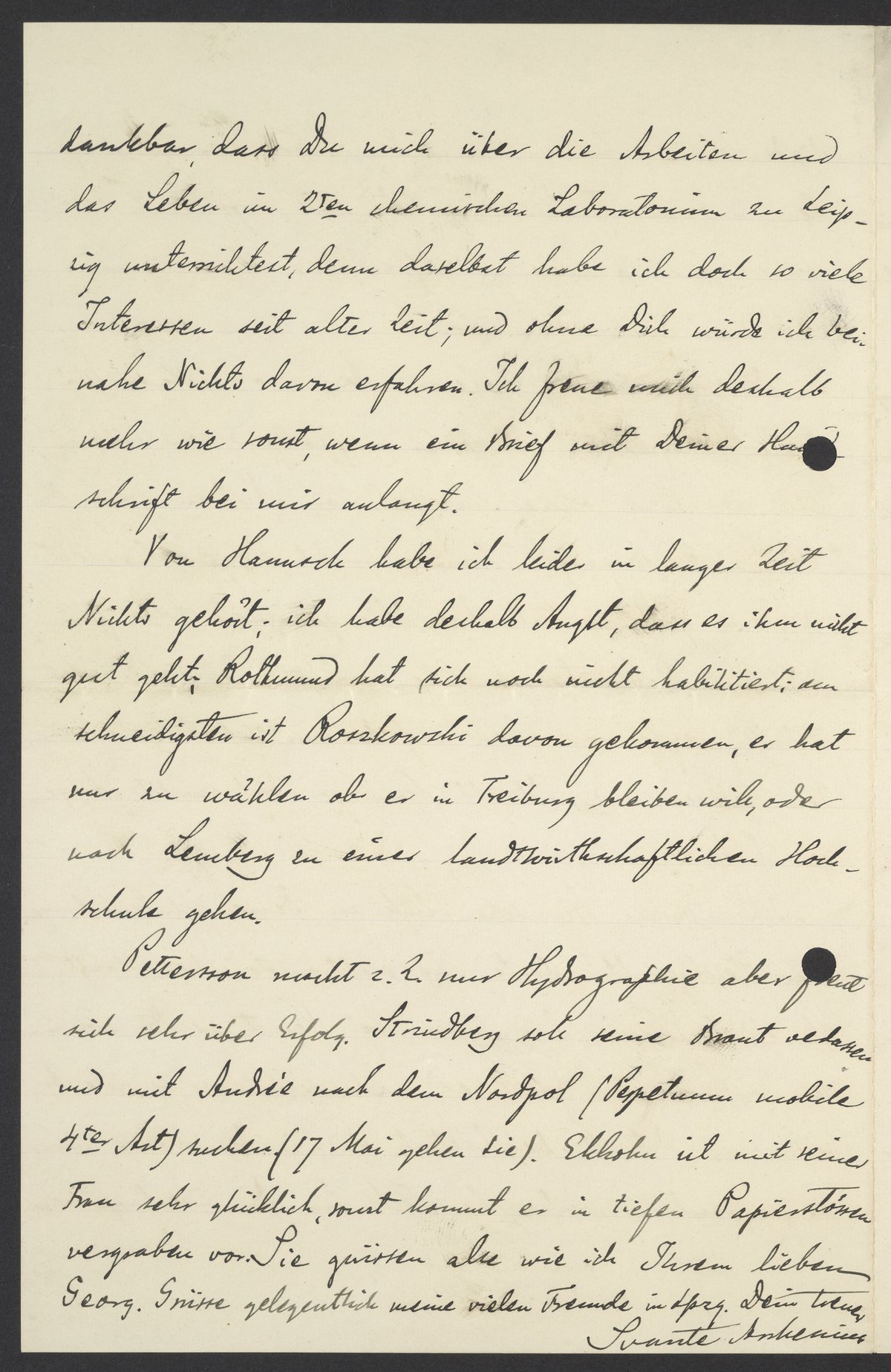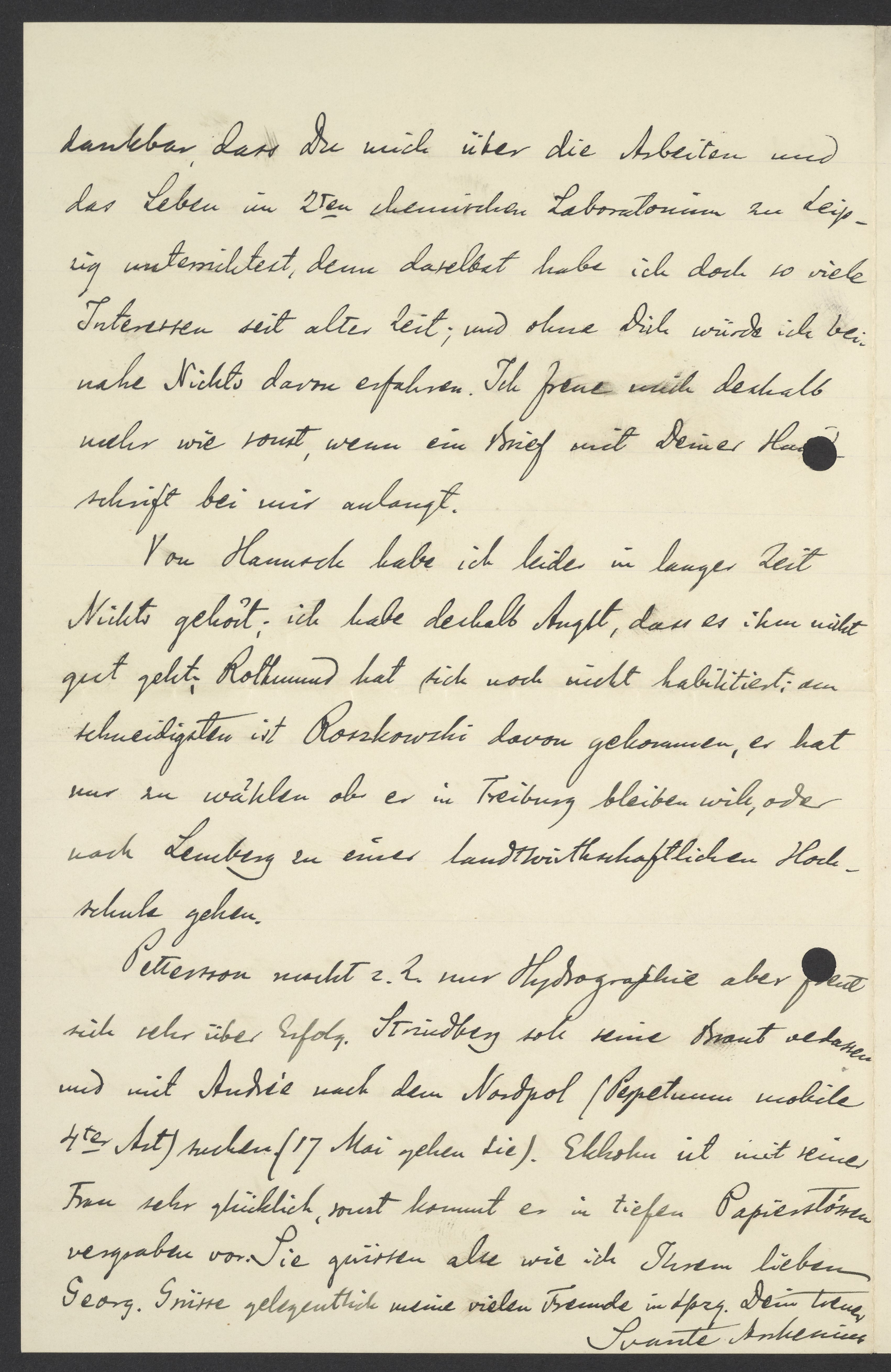 Petersson macht z.Z. nur Hydrographie aber freut sich sehr über Erfolg. Strindberg soll seine Braut verlassen und mit Andrée nach dem Nordpol/Perpetuum mobile (4ter Art) suchen (17. Mai gehen sie). Ekholm ist mit seiner Frau sehr glücklich, sonst kommt es in Papierstössen vergraben vor. Sie gruessen alle wie ich Ihrem lieben Georg. Gruesse gelegentlich meine viele Freunde in Lpzg. Dein treuer Svante Arrhenius