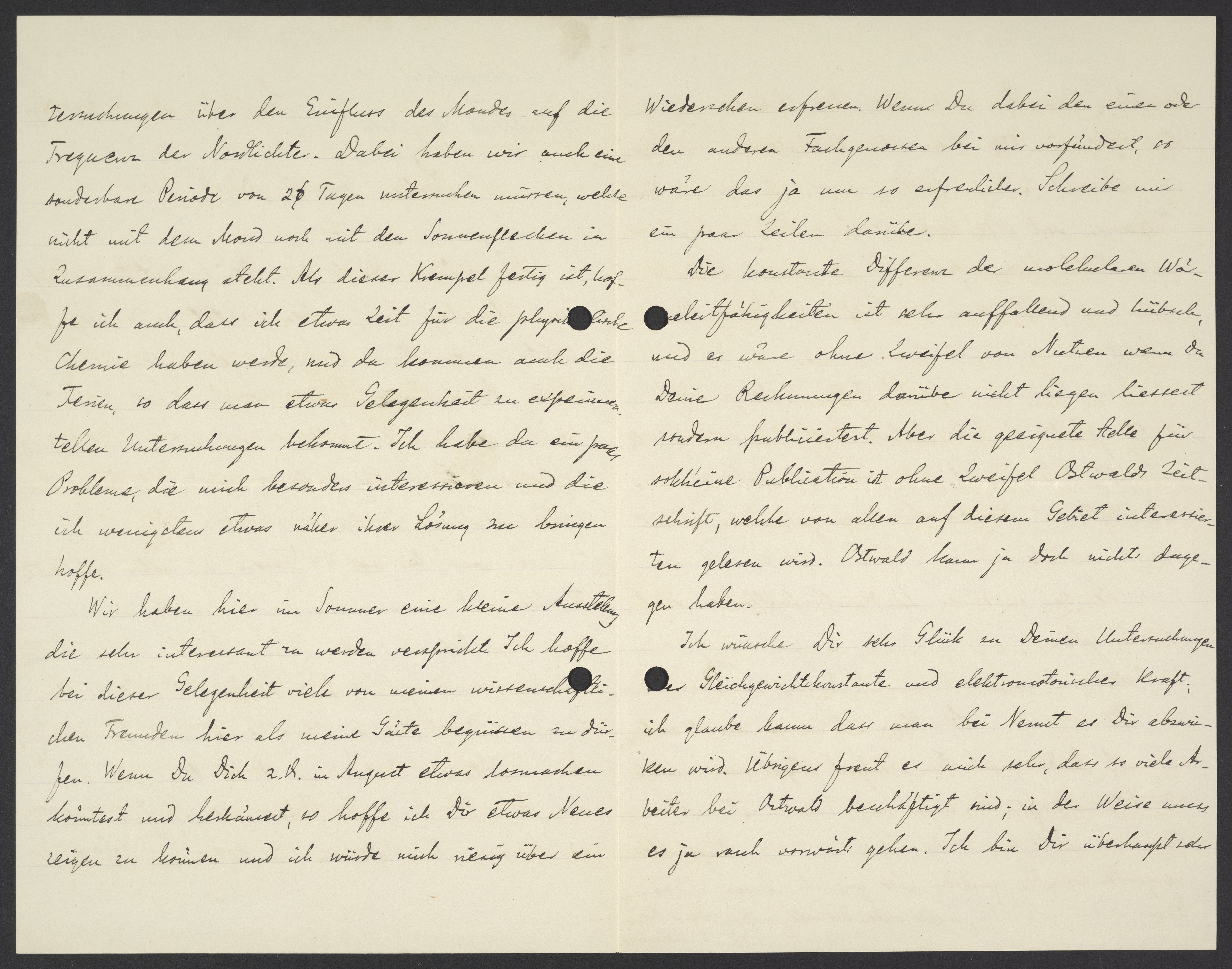 Untersuchungen über den Einfluss des Mondes auf die Frequenz der Nordlichte. Dabei haben wir auch eine sonderbare Periode von 2 Tagen untersuchen müssen, welche nicht mit dem Mond noch nicht den Sonnenflecken in Zusammenhang steht. Als dieser Krempel fertig ist, hoffe ich auch, dass ich etwas Zeit für die physikalische Chemie haben werde, und da kommen auch die Ferien, so dass man etwas Gelegenheit zu experimentellen Untersuchungen bekommt. Ich habe da ein paar Probleme, die mich besonders interessieren und die ich wenigstens etwas näher ihrer Lösung zu kriegen hoffe.