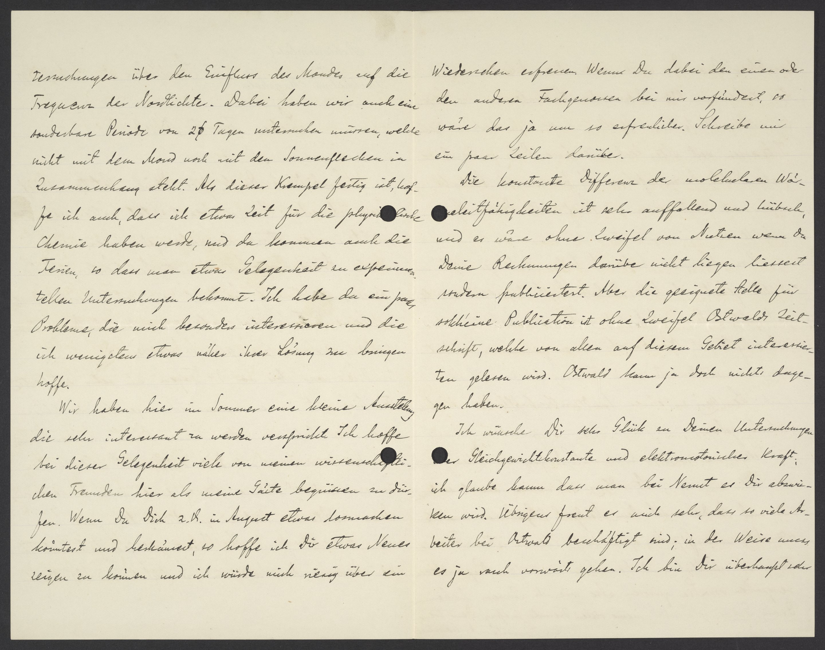 Untersuchungen über den Einfluss des Mondes auf die Frequenz der Nordlichte. Dabei haben wir auch eine sonderbare Periode von 2 Tagen untersuchen müssen, welche nicht mit dem Mond noch nicht den Sonnenflecken in Zusammenhang steht. Als dieser Krempel fertig ist, hoffe ich auch, dass ich etwas Zeit für die physikalische Chemie haben werde, und da kommen auch die Ferien, so dass man etwas Gelegenheit zu experimentellen Untersuchungen bekommt. Ich habe da ein paar Probleme, die mich besonders interessieren und die ich wenigstens etwas näher ihrer Lösung zu kriegen hoffe.