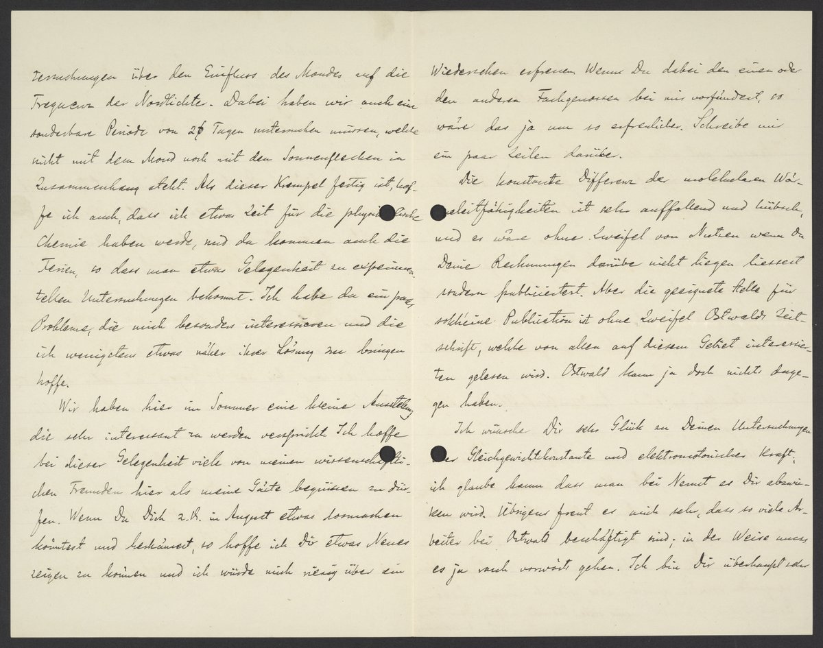 Petersson macht z.Z. nur Hydrographie aber freut sich sehr über Erfolg. Strindberg soll seine Braut verlassen und mit Andrée nach dem Nordpol/Perpetuum mobile (4ter Art) suchen (17. Mai gehen sie). Ekholm ist mit seiner Frau sehr glücklich, sonst kommt es in Papierstössen vergraben vor. Sie gruessen alle wie ich Ihrem lieben Georg. Gruesse gelegentlich meine viele Freunde in Lpzg. Dein treuer Svante Arrhenius