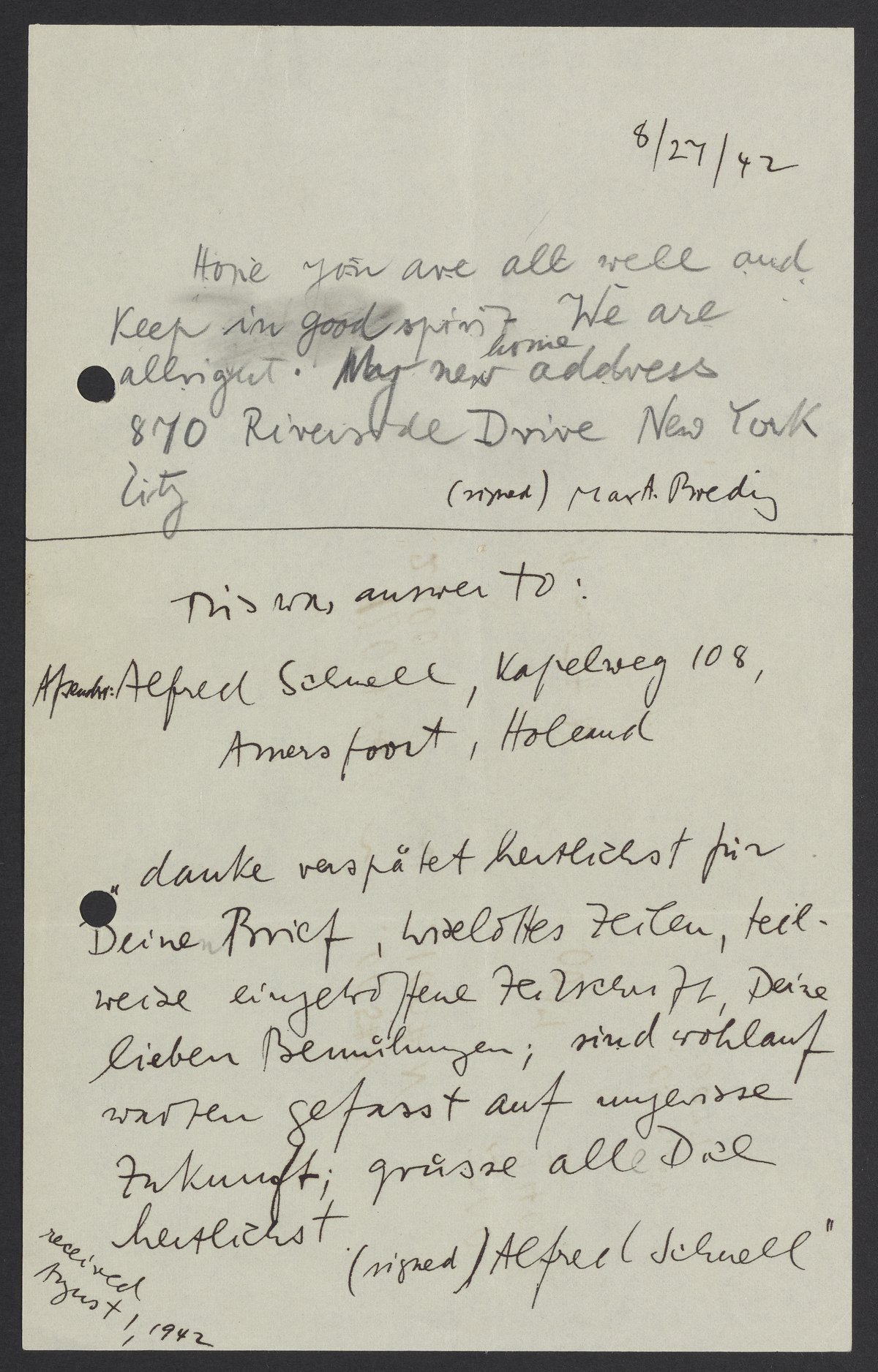 Message from Alfred and Eva Schnell to Max Bredig, September 30, 19421942-Sep-30 – 1942-Oct