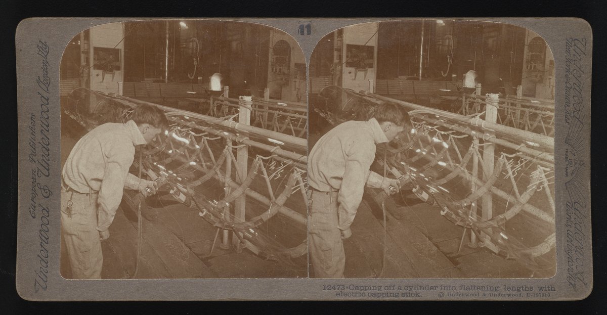 “Capping off a Cylinder into Flattening Lengths with Electric Capping Stick.” Underwood & Underwood, n.d. Underwood & Underwood Stereographs of Manufacturing Industries. Science History Institute. Philadelphia. https://digital.sciencehistory.org/works/rj4304528.