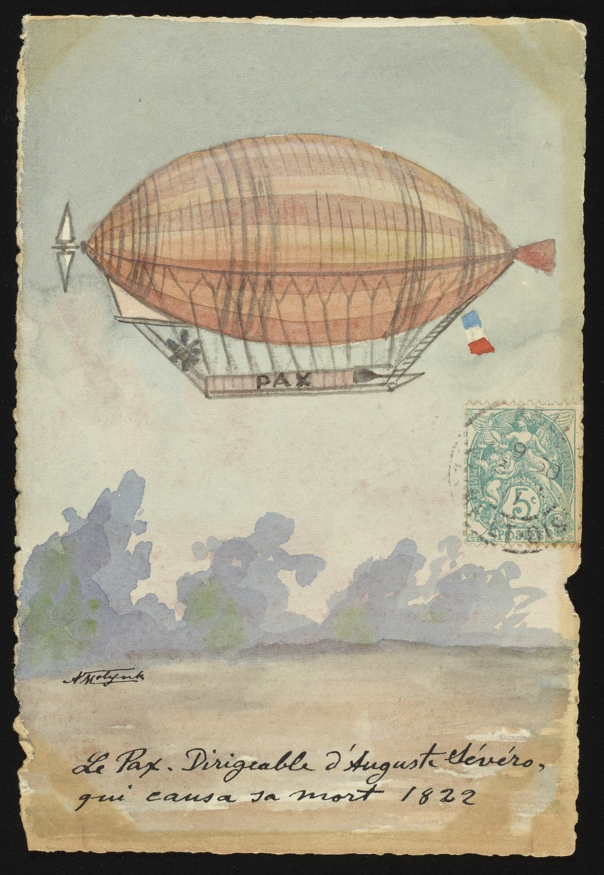 Postcard featuring a hand-drawn illustrated depiction of the semi-rigid airship "Pax" flown by Brazilian aeronaut Augusto Sévéro (1864-1902) and French mechanic Georges Saché over Paris on May 12, 1902. Propelled by an internal combustion engine, the airship caught fire and crashed, killing both men. This postcard is part of a set originally collected in a scrapbook entitled Album Gravures et Cartes-Postales: Vieux Paris Types Petits Métiers et Cris De La Rue (1909).