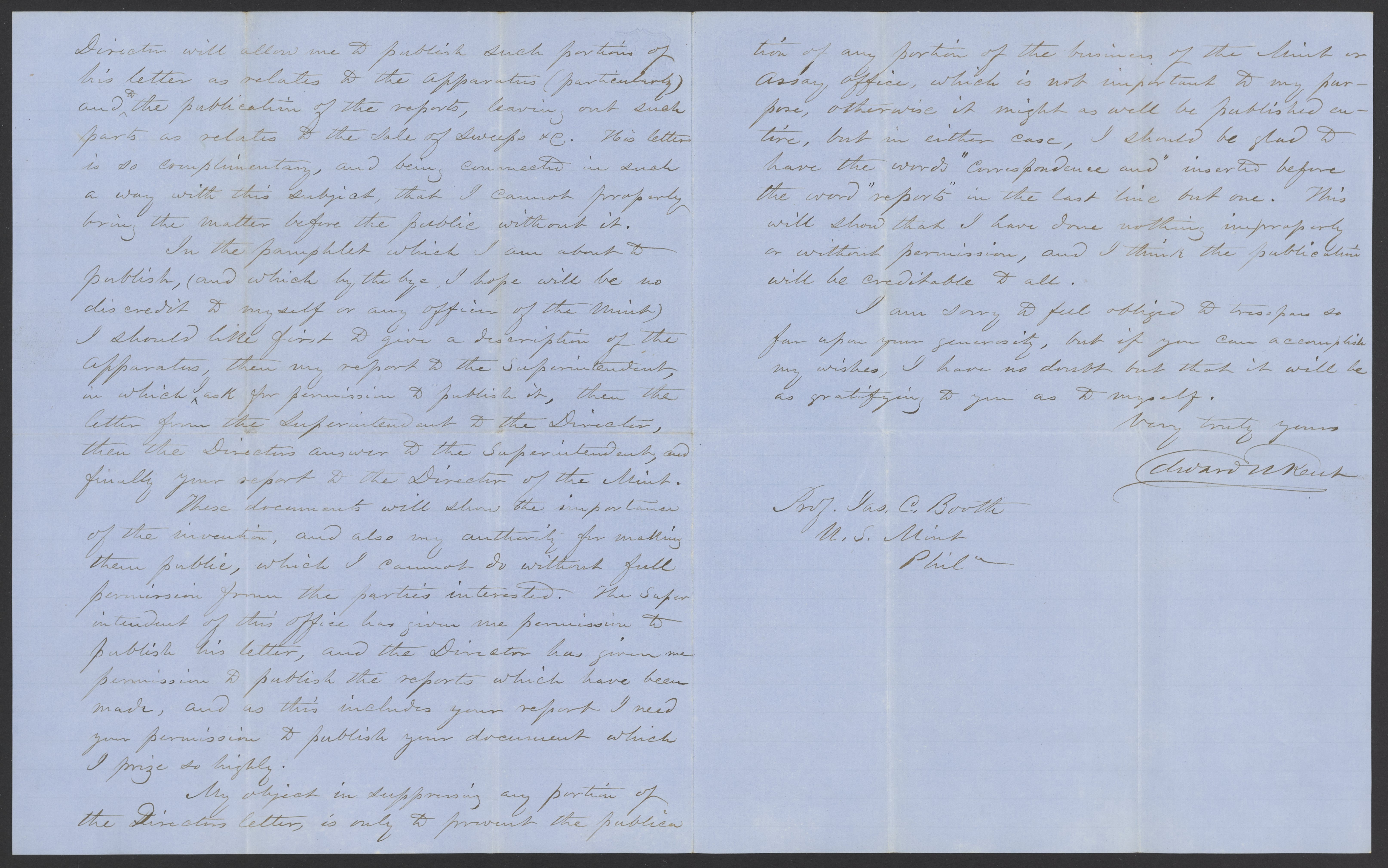 Letter from Edward N. Kent to James Curtis Booth, October 18, 1855