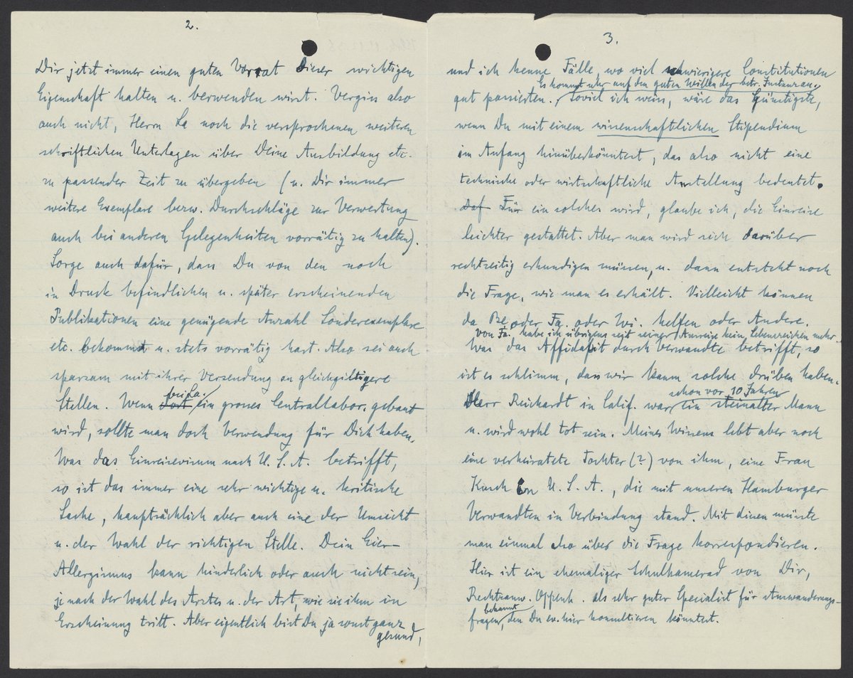 Dir jetzt immer einen guten Vorrat Dieser wichtigen Eigenschaft halten u. verwenden wirst. Vergiss also auch nicht, Hernn La. noch die versprochenen weiteren schriftlichen Unterlagen über Deine Ausbildung etc. zu passender Zeit zu übergeben (u. Dir immer weitere Exemplare bezw. Durschläge zur Verwertung auch bei anderen Gelegenheiten vorrätig zu halten). Sorge auch dafür, dass Du von den noch in Druck befindlichen u. später erscheinenden Publikationen eine genügend Anzahl Sonderexemplare etc. bekommst u. stets vorrätig hast. Also sei auch sparsam mit ihrer Versendung an gleichgiltigere Stellen. Wenn bei La. ein grosses Centrallabor. gebaut wird, sollte man doch Verwendung für Dich haben. Was das Einreisevisum nach U.S.A. betrifft, so ist das immer eine wichtige u. kritische Sache, hauptsächlich aber auch eine der Umsicht u. der Wahl der richtigen Stelle. Dein Eier-Allergismus kann hinderlich oder auch nicht sein, je nach der Wahl des Arztes u. der Art, wie sie ihm in Erscheinung tritt. Aber eigentlich bist Du ja sonst ganz gesund,