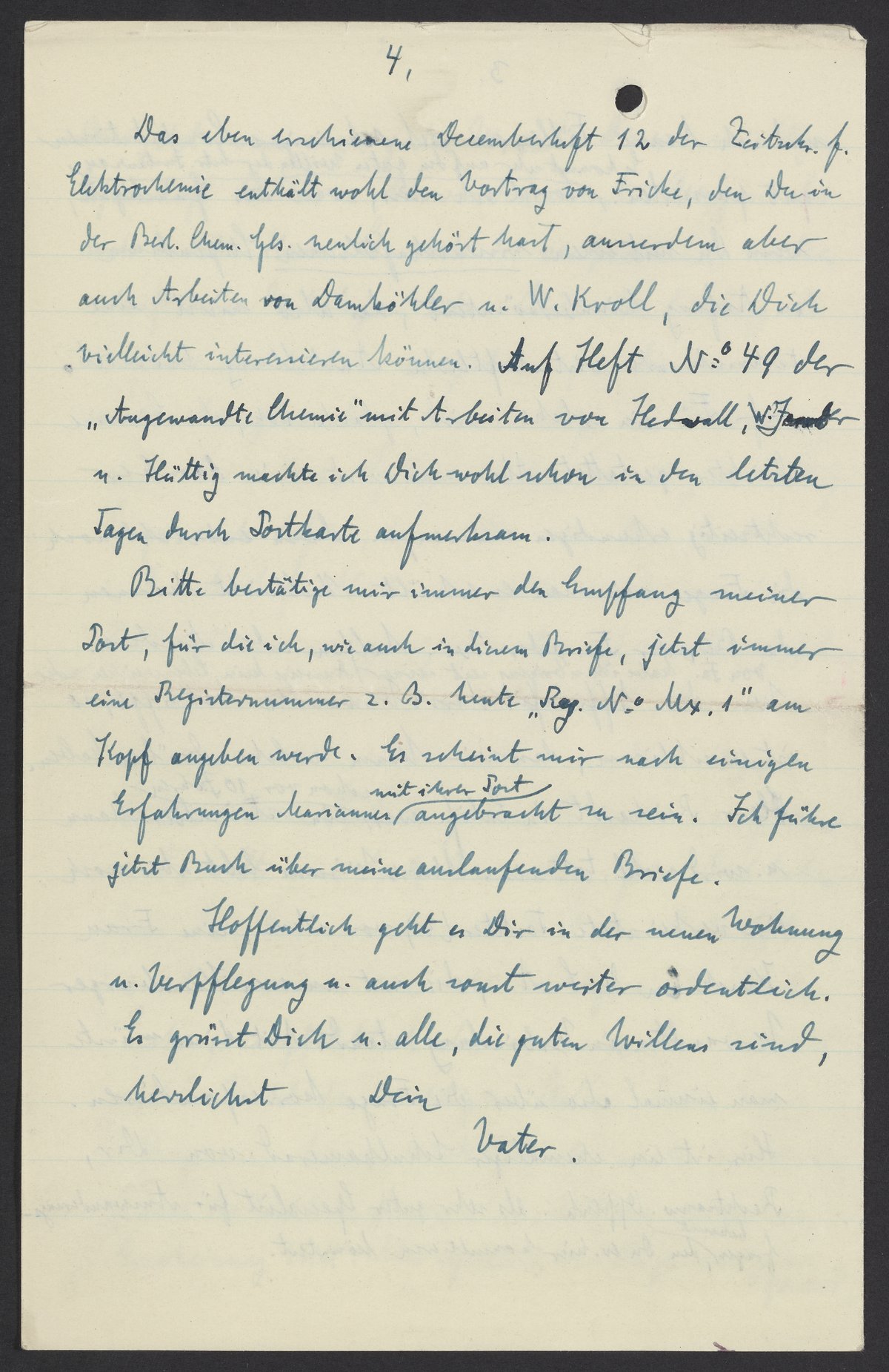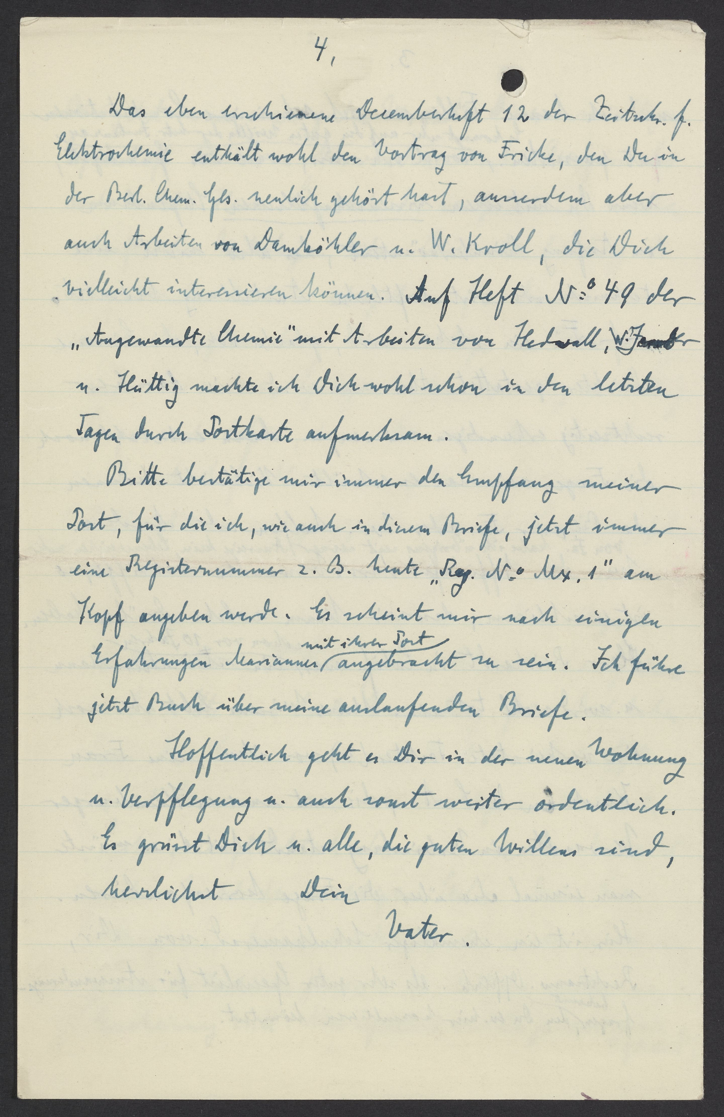 The recently published December issue, #12, of the Journal of Electrochemistry probably contains Fricke’s lecture, which you recently heard at the Berlin Chemical Society. Of additional interest are works by Damköhler and W. Krodl. In the last few days, I probably informed you about various works by Hedvall, W. Jander, and Hüttig in issue #49 of “Applied Chemistry” by postcard.