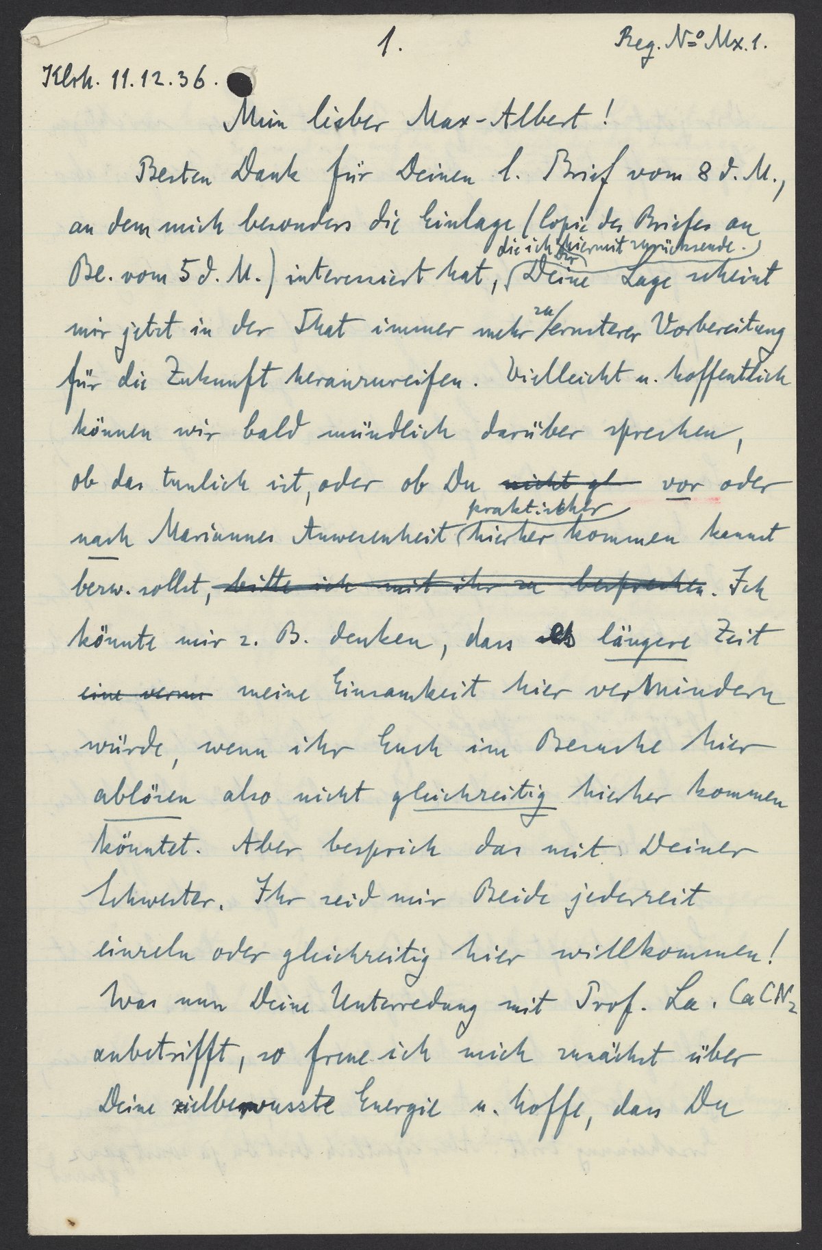 Bitte bestätige mir immer den Empfang meiner Post für die ich, wie auch in diesem Briefe, jetzt immer eine Registernummer z.B. heute „Reg. No Mx. 1“ am Kopf angeben werde. Es scheint mir nach einigen Erfahrungen Mariannes mit ihrer Post angebracht zu sein. Ich führe jetzt Buch über meine auslaufenden Briefe.