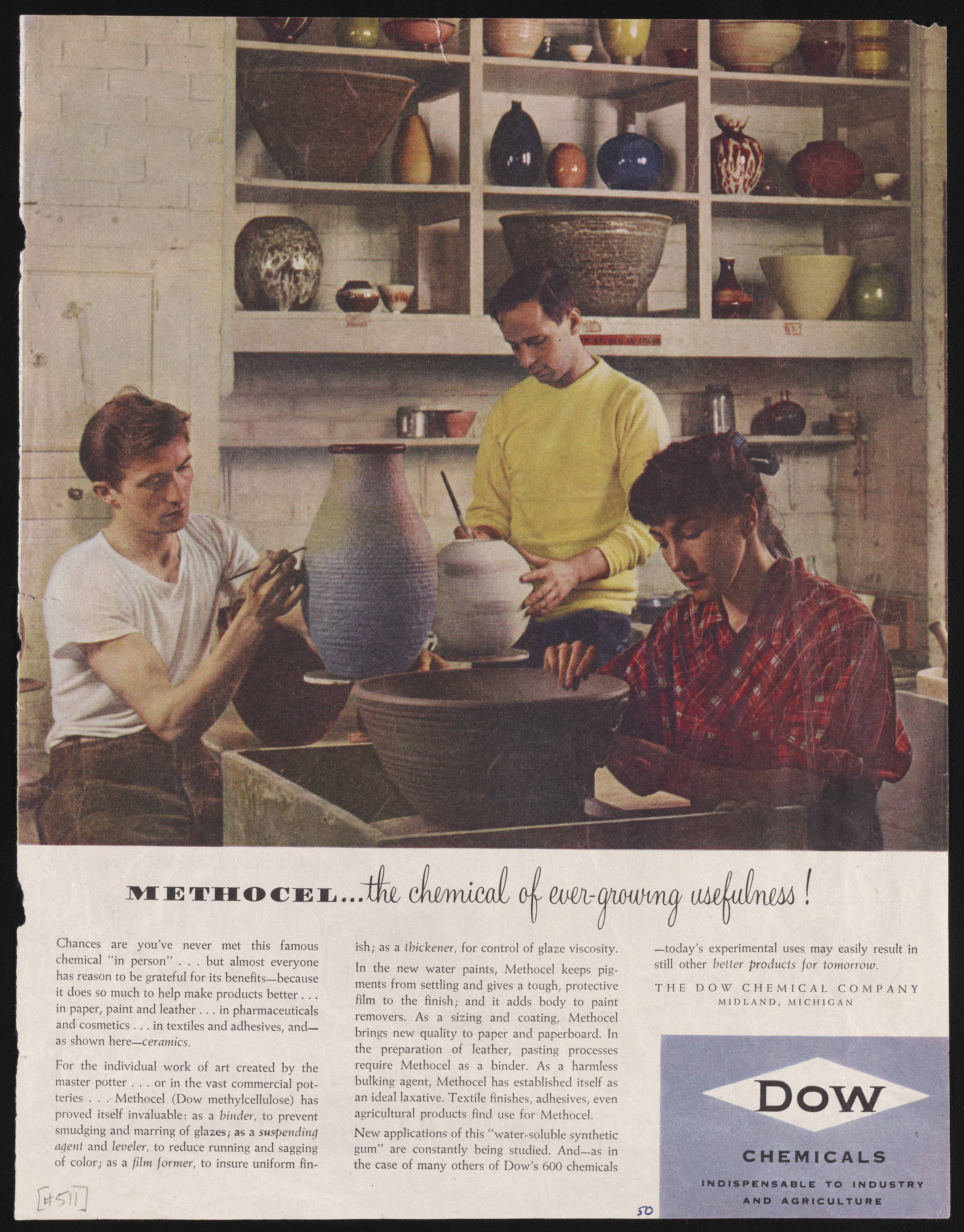 Color print advertisement for Methocel (Dow methylcellulose), the trade name for water-soluble polymers derived from cellulose. The advertisement features a photograph of group of young people working in a ceramics studio. Accompanying text describes the many uses of Methocel in ceramics, as well as in other industries. This advertisement appeared in the September 9, 1950 edition of The Saturday Evening Post.