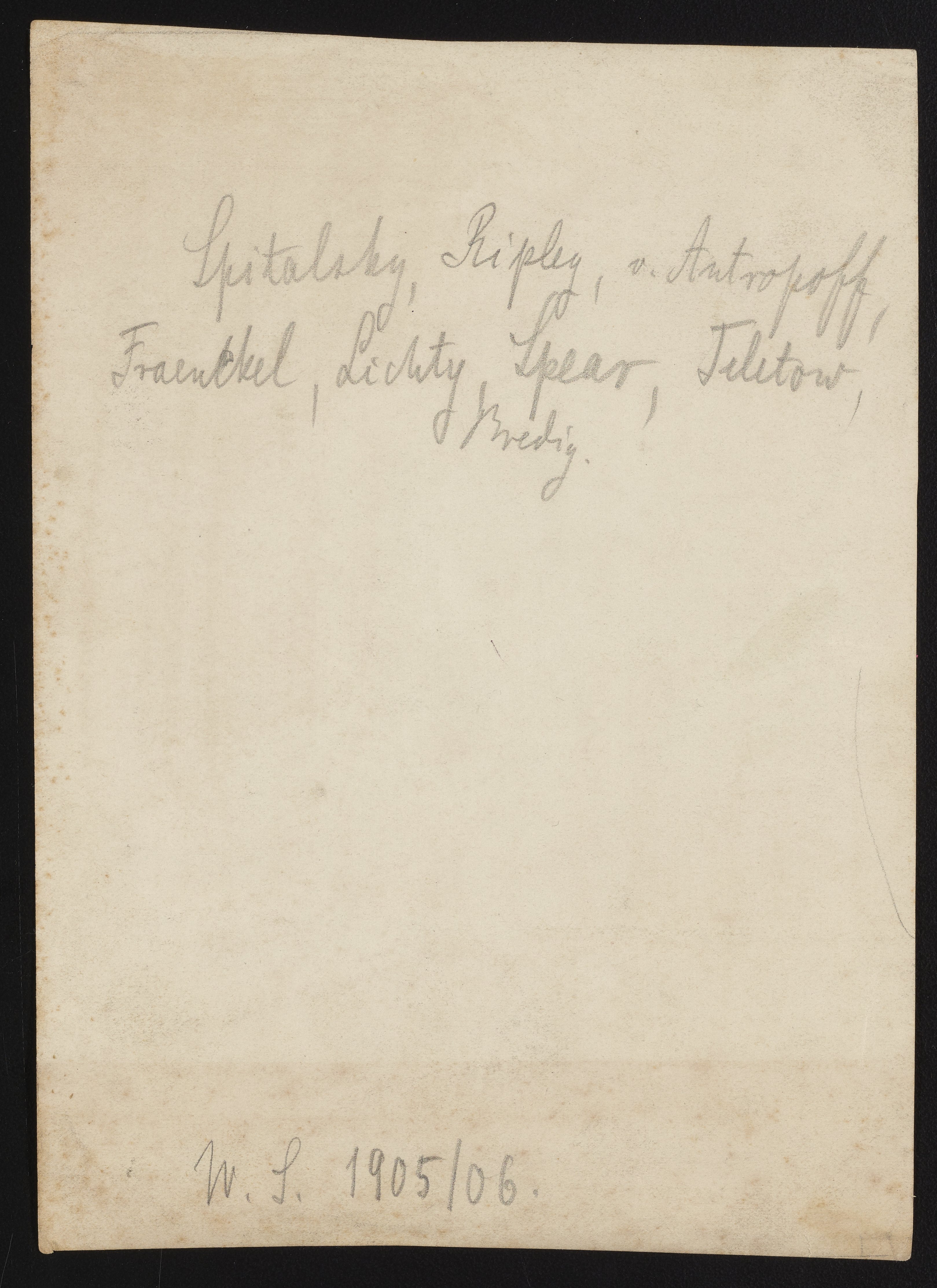 Bredig's writing on the back of the photograph identifies those in the photograph as "E. Spitalsky," "P. F. Ripley," Andreas von Antropoff (1878-1956), "Fraenkel", "David M. Lichty," Ellwood Barker Spear (1875-1943), Iwan Serhijowytsch Teletow (1878- 1947), and Georg Bredig.