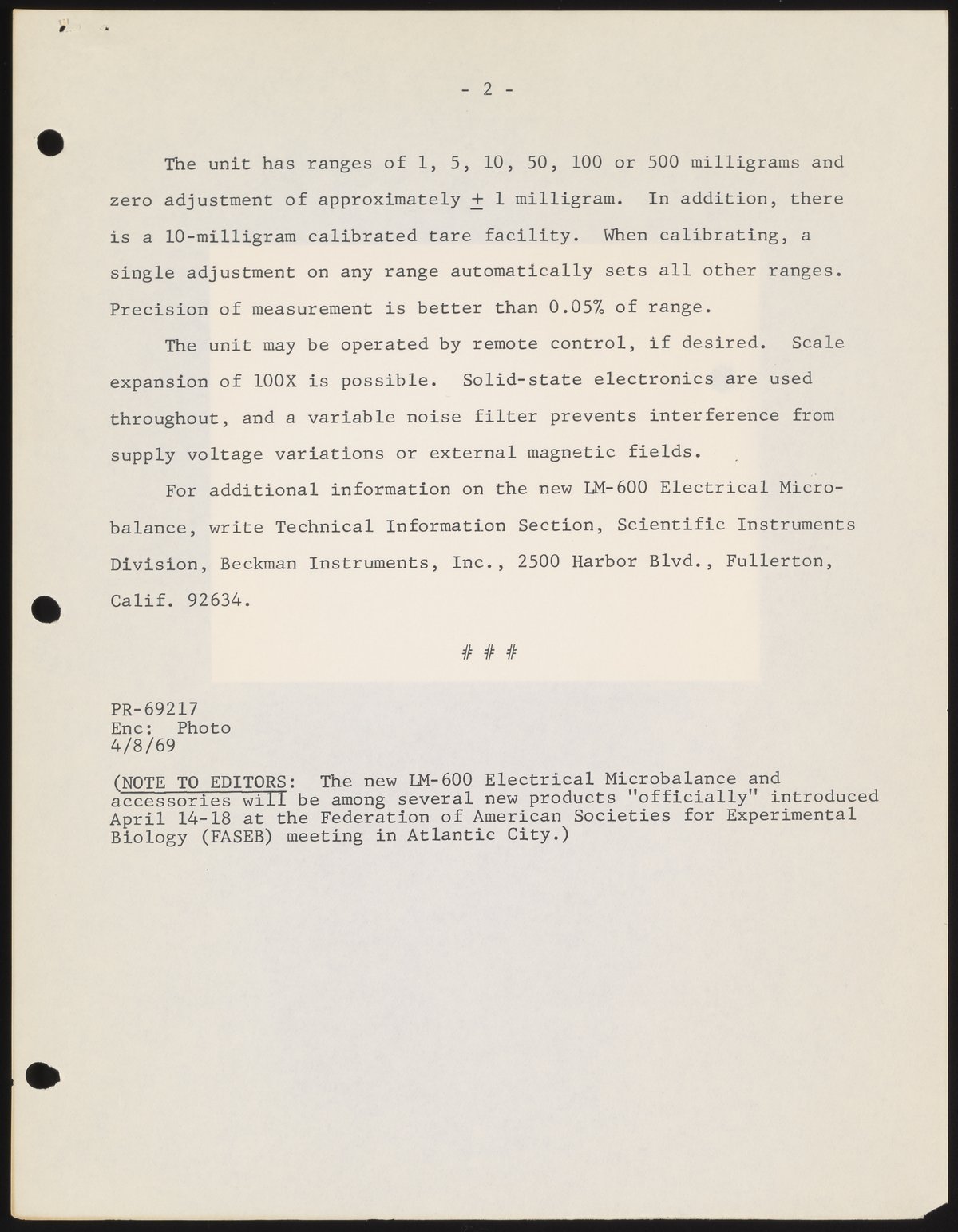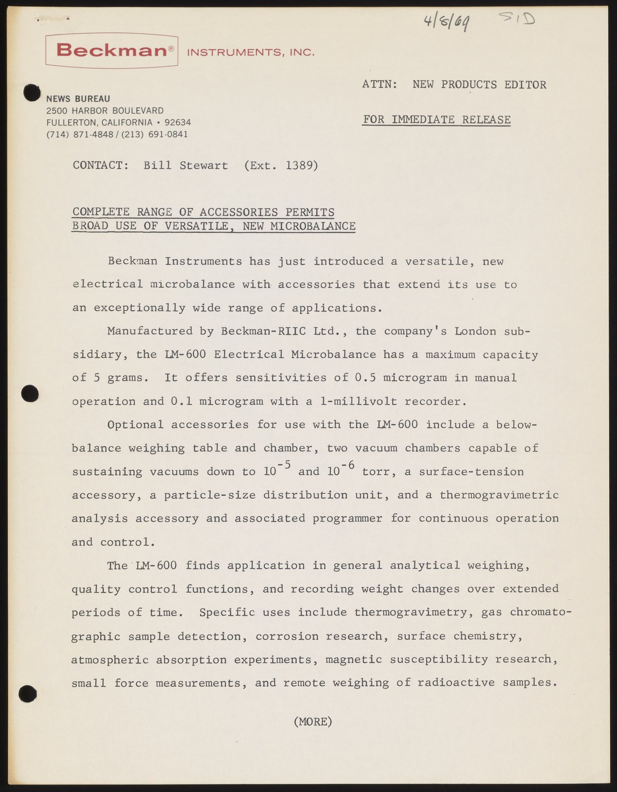 Stewart, Bill. “Complete Range of Accessories Permits Broad Use of Versatile, New Microbalance,” April 8, 1969. Beckman Historical Collection, Box 58, Folder 64. Science History Institute. Philadelphia. https://digital.sciencehistory.org/works/rn301193r.