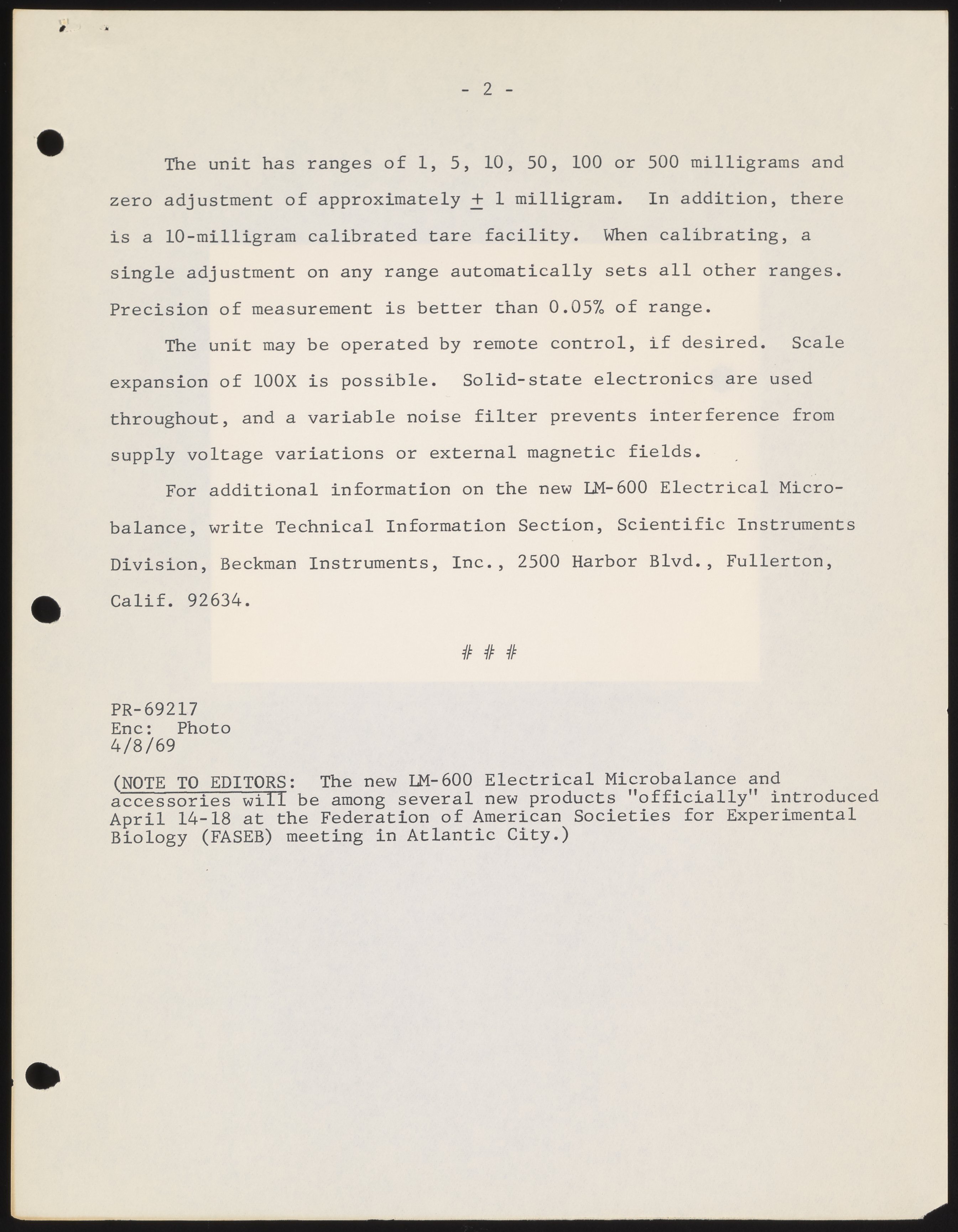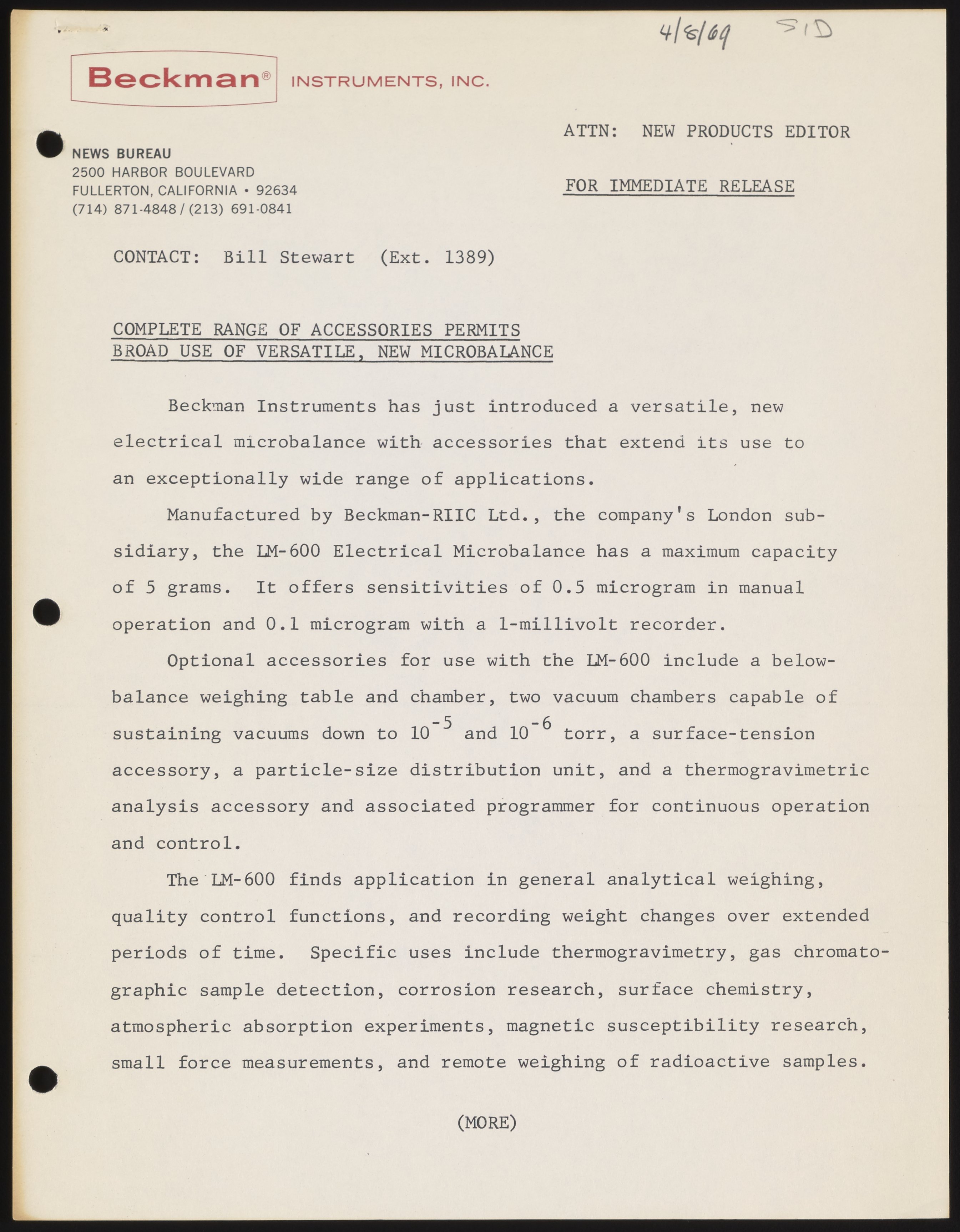 Complete Range of Accessories Permits Broad Use of Versatile, New Microbalance