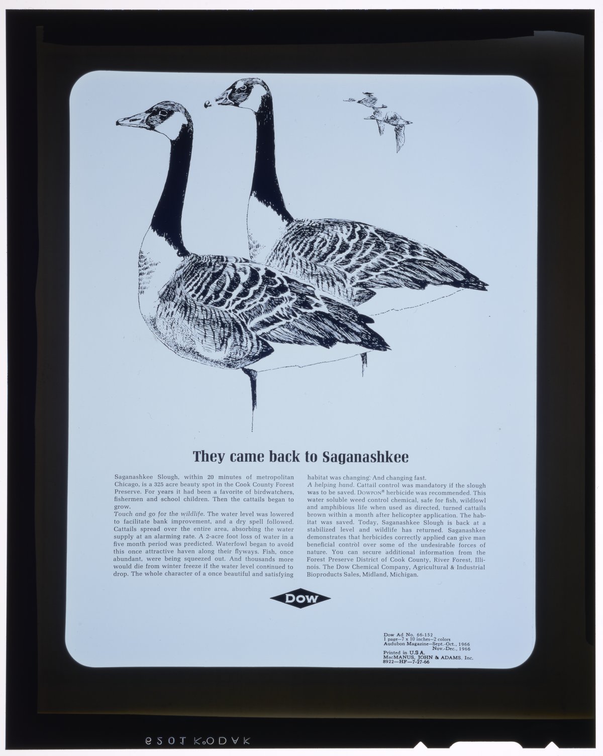 Transparency copy of a print advertisement for Dowpon, a herbicide marketed and sold by the Dow Chemical Company. The advertisement features an illustration of several waterfowl, with accompanying text detailing the impact of weeds like cattail on the Saganashkee Slough near Chicago. The text goes on to extol the benefits of Dowpon for weed control and its successful application to restore the natural environment of the slough.
