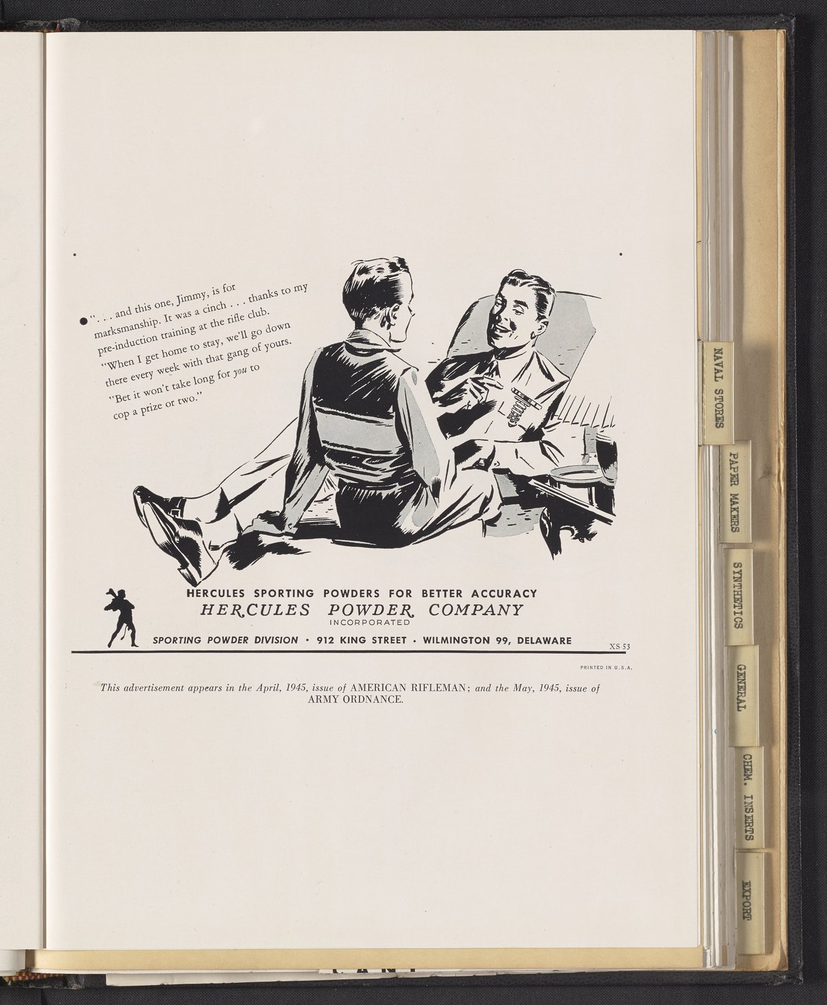 Hercules Incorporated. “Advertisement for Hercules Sporting Powders.” 1945 Hercules Advertisements, 1945. Records of Hercules Incorporated, Volume 1945. Science History Institute. Philadelphia. https://digital.sciencehistory.org/works/rn3012149.