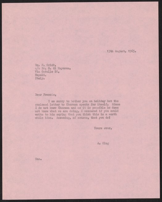 Klug, A. (Aaron), Sir. “Letter from Aaron Klug to Francis Crick, August 13, 1965,” August 13, 1965. History of Molecular Biology Collection, Box 19, Folder 22. Science History Institute. Philadelphia. https://digital.sciencehistory.org/works/rn3hqkw.