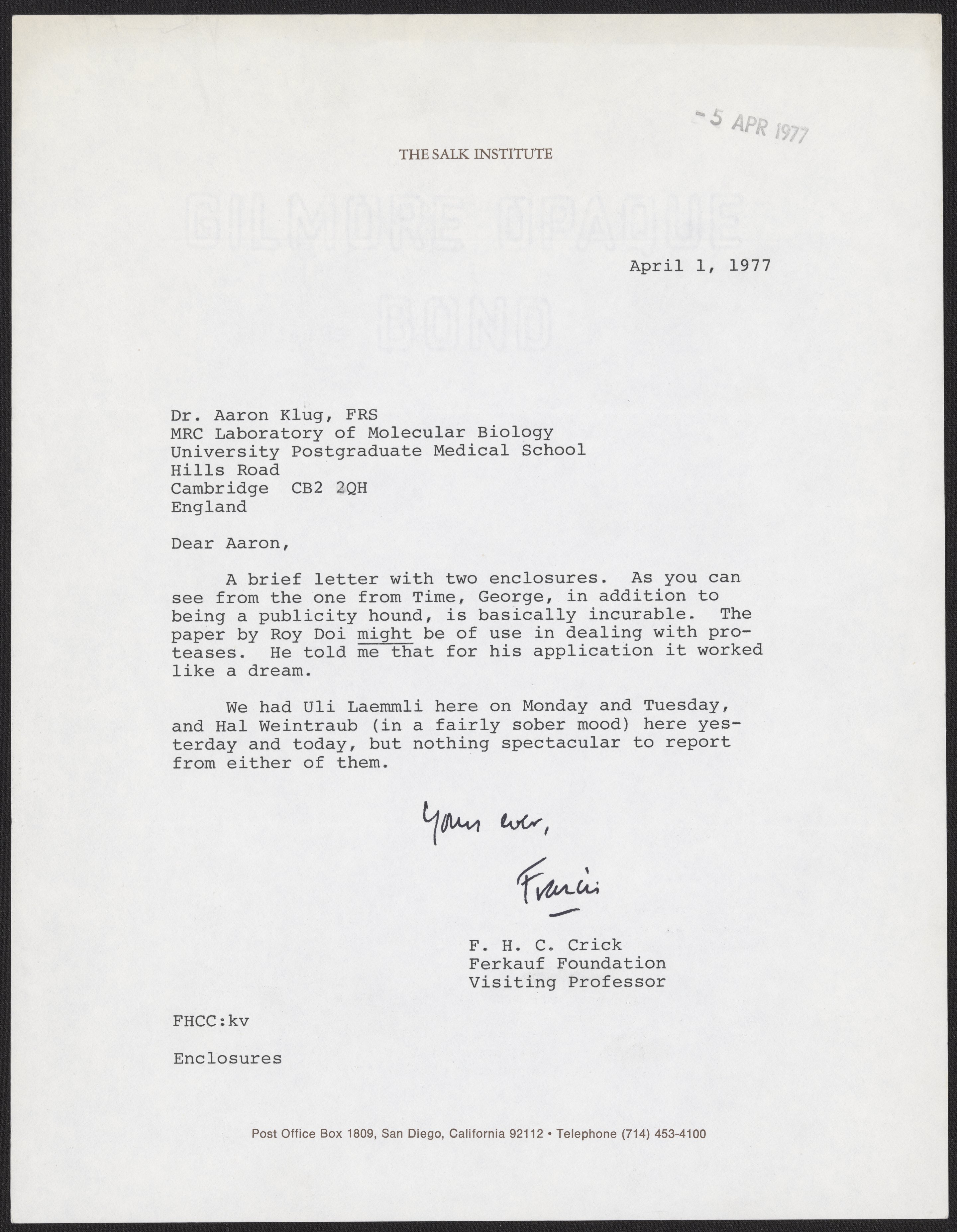 Crick, Francis. “Letter from Francis Crick to Aaron Klug, April 1, 1977,” April 1, 1977. History of Molecular Biology Collection, Box 20, Folder 1. Science History Institute. Philadelphia. https://digital.sciencehistory.org/works/rnbzshr.