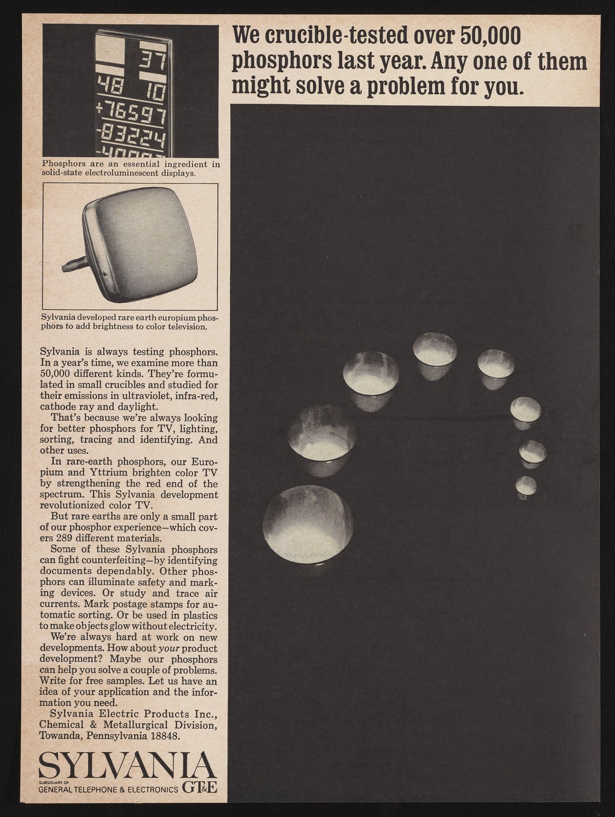 We crucible tested over 50,000 phosphors last year. Any one of them might solve a problem for you.