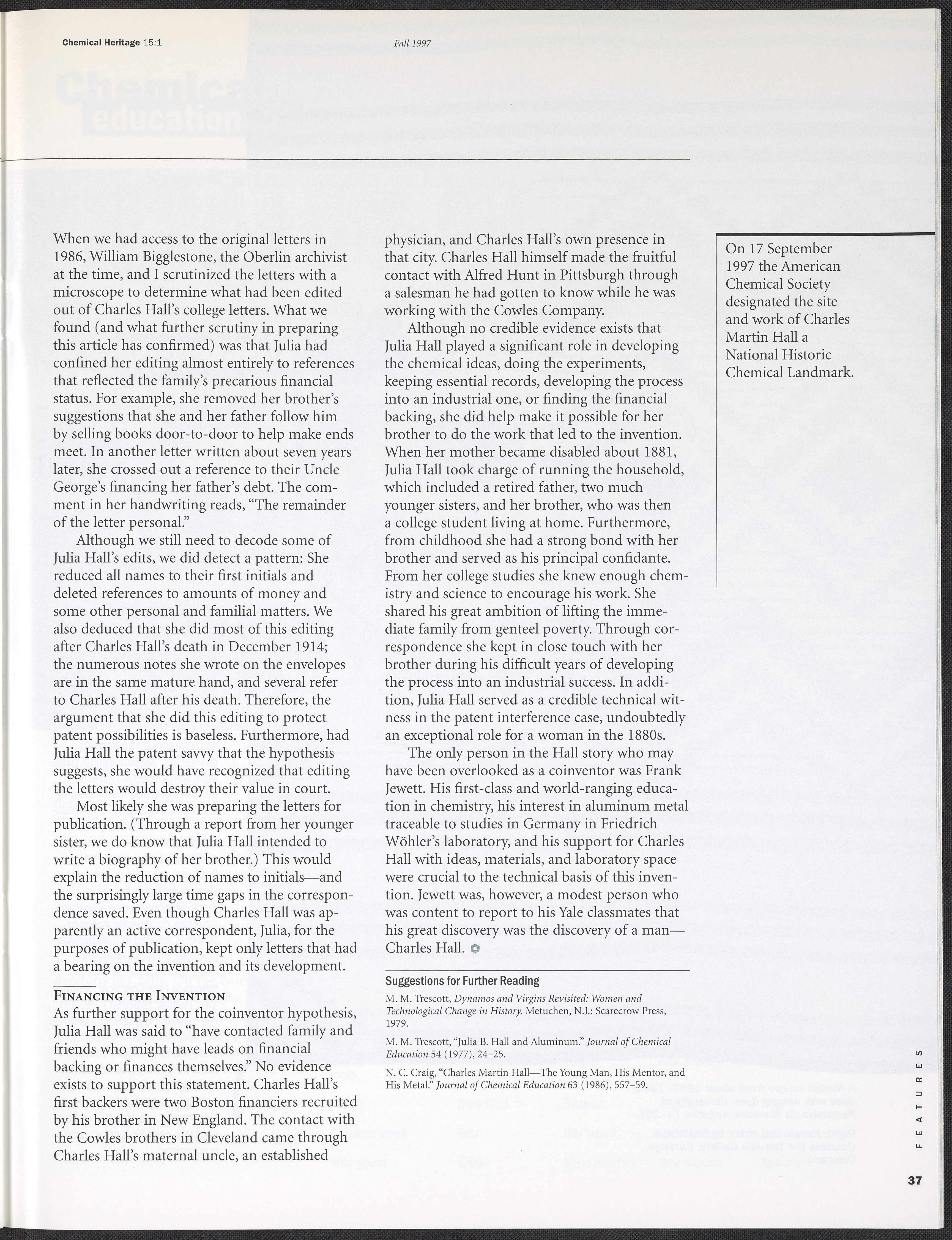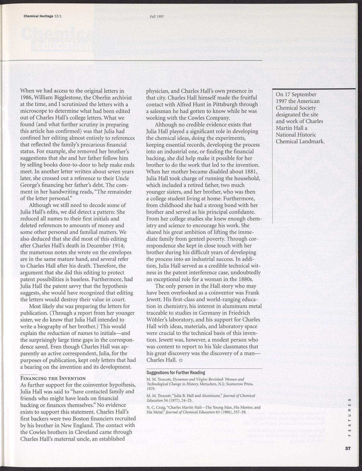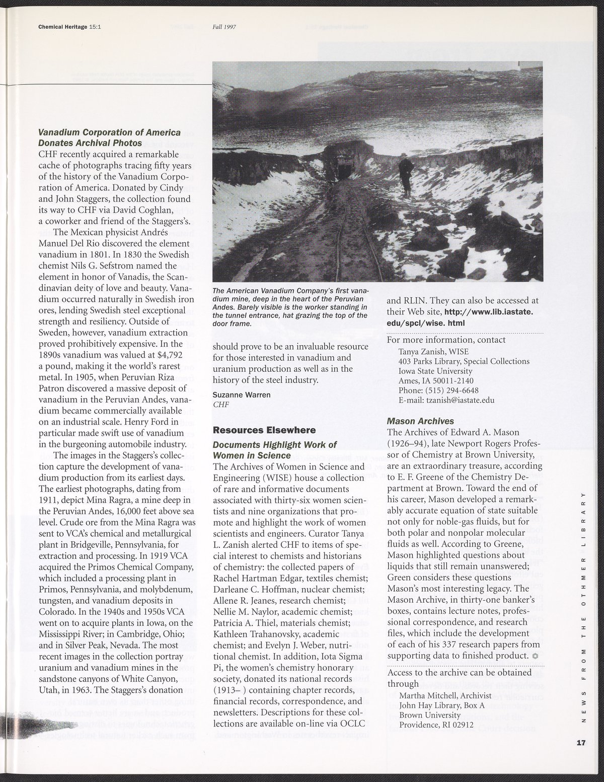 “Chemical Heritage, Volume 15 Number 1.” Philadelphia, Pennsylvania: Chemical Heritage Foundation, 1997. 099C001. Science History Institute. Philadelphia. https://digital.sciencehistory.org/works/row1swz.