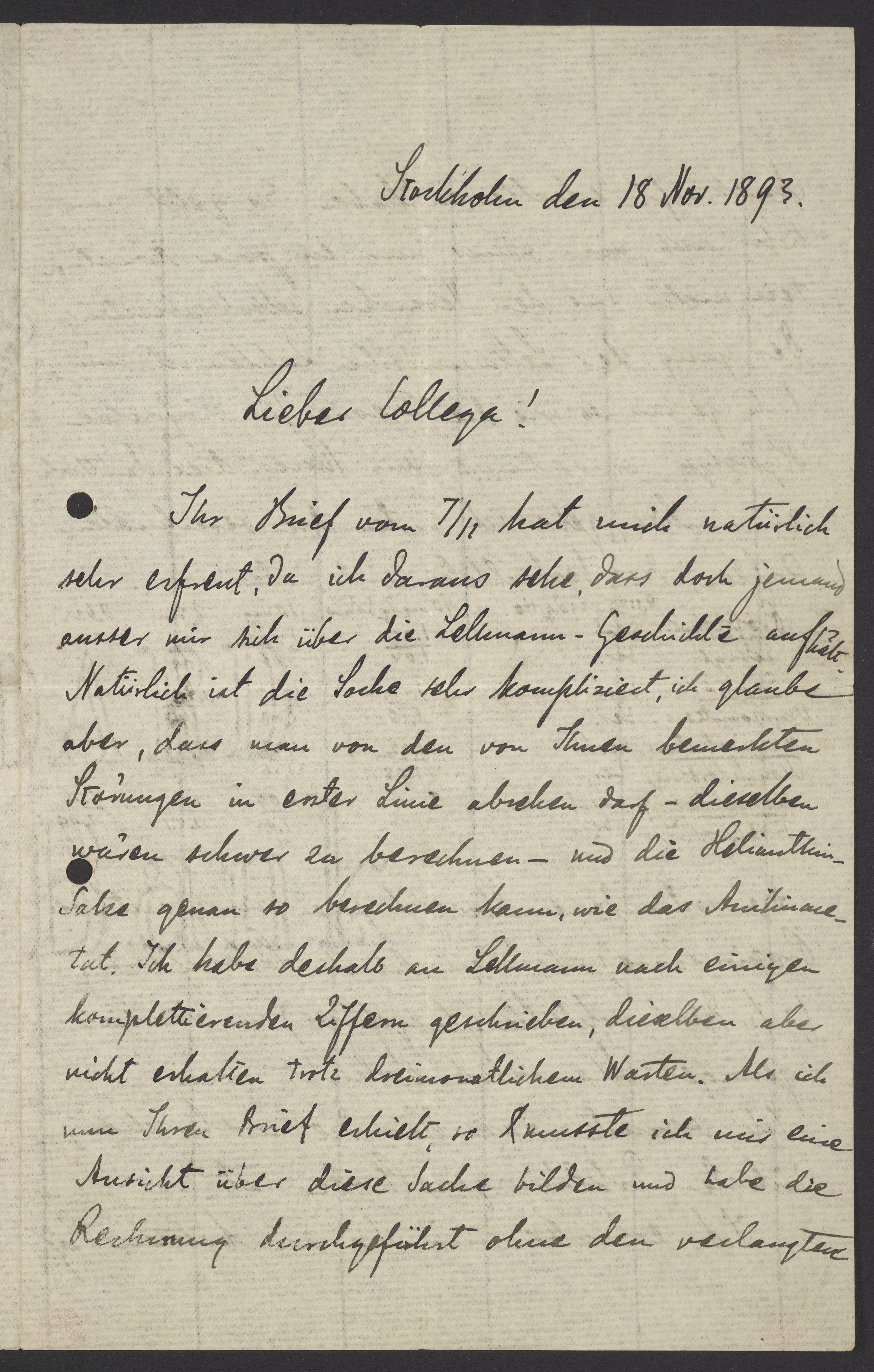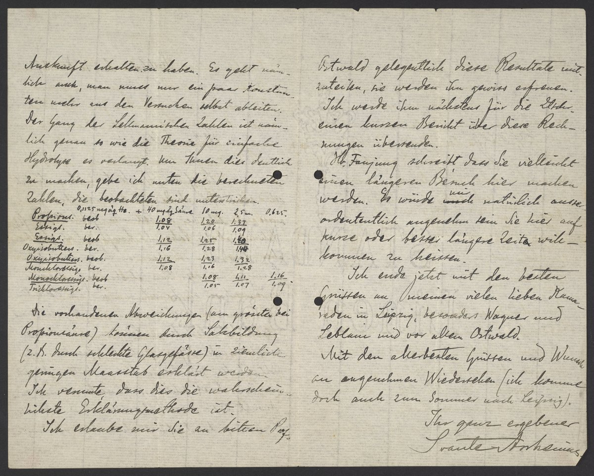 Arrhenius, Svante. “Letter from Svante Arrhenius to Georg Bredig, November 1893,” November 18, 1893. Papers of Georg and Max Bredig, Box 1, Folder 4. Science History Institute. Philadelphia. https://digital.sciencehistory.org/works/rpzv143.
