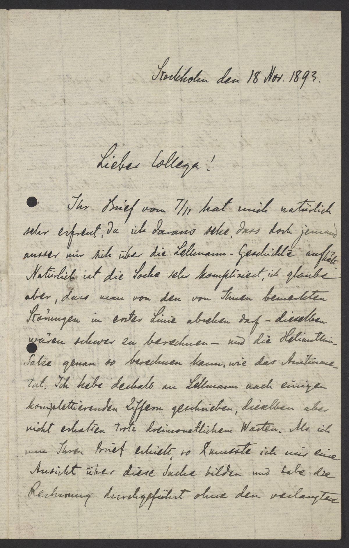 Ihr Brief vom 7/11 hat mich natürlich sehr erfreut, da ich daraus sehe, dass doch jemand ausser mir sich über die Sellmann-Geschichte aufhält. Natürlich ist die Sache sehr kompliziert, ich glaube aber, dass man von den von Ihnen bemerkten Störung in erster Linie absehen darf – dieselben wären schwer zu berechnen – und die Helium-Salze genau so berechnen kann, wie das wie das Anilinase tat. Ich habe deshalb an Sellmann nach einigen komplettierenden Ziffern geschrieben, dieselben aber nicht erhalten trotz dreimonatlichem Warten. Als ich Ihren Brief erhielt, so musste ich nur eine Ansicht über diese Sache bilden und habe die Rechnung durchgeführt, ohne den verlangten