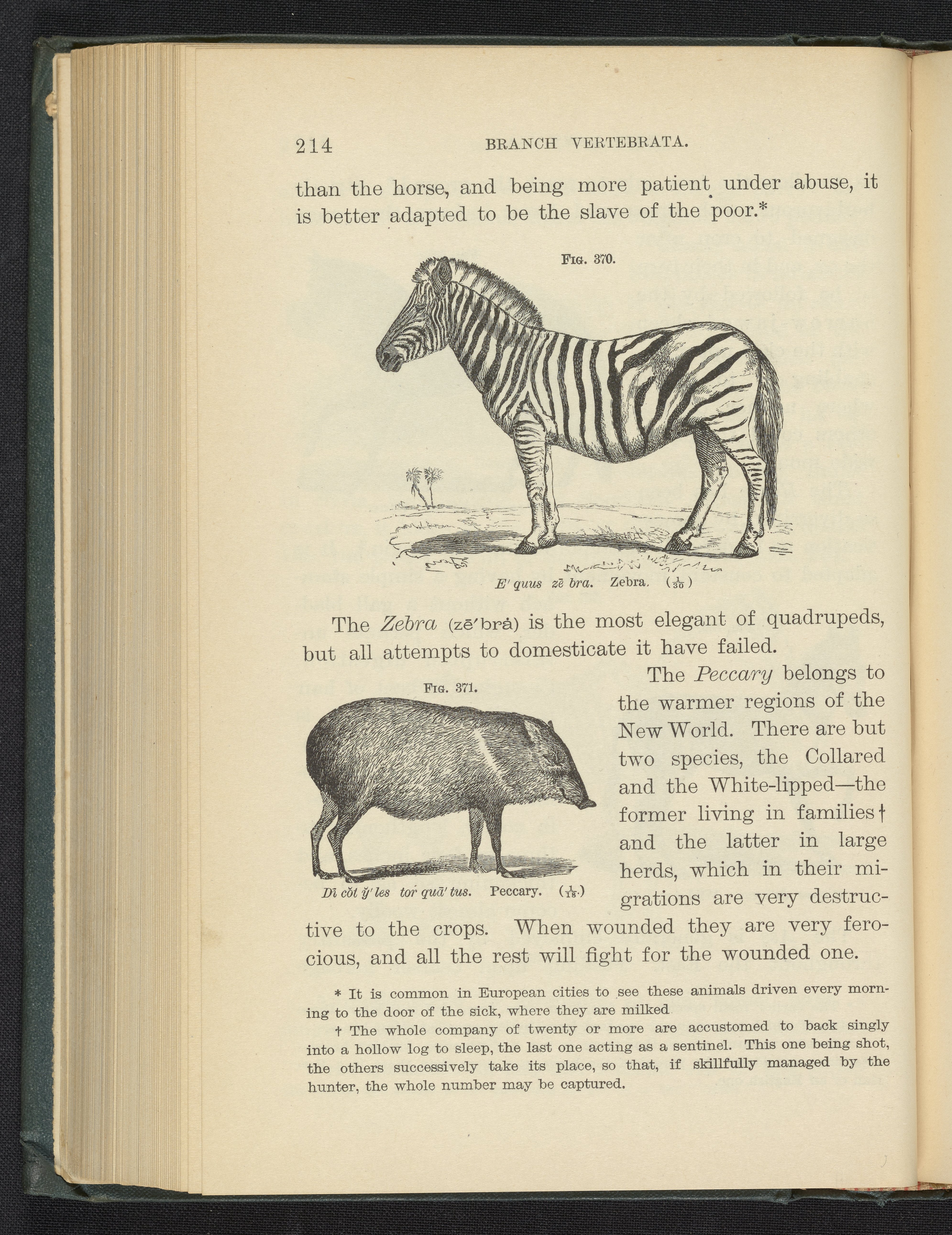 Steele, Joel Dorman, and Jenks, J. W. P. (John Whipple Potter). “Figure 370. Zebra. Figure 371. Peccary.” Popular Zoology. New York, New York: Chautauqua Press, 1887. https://digital.sciencehistory.org/works/rqowyak.