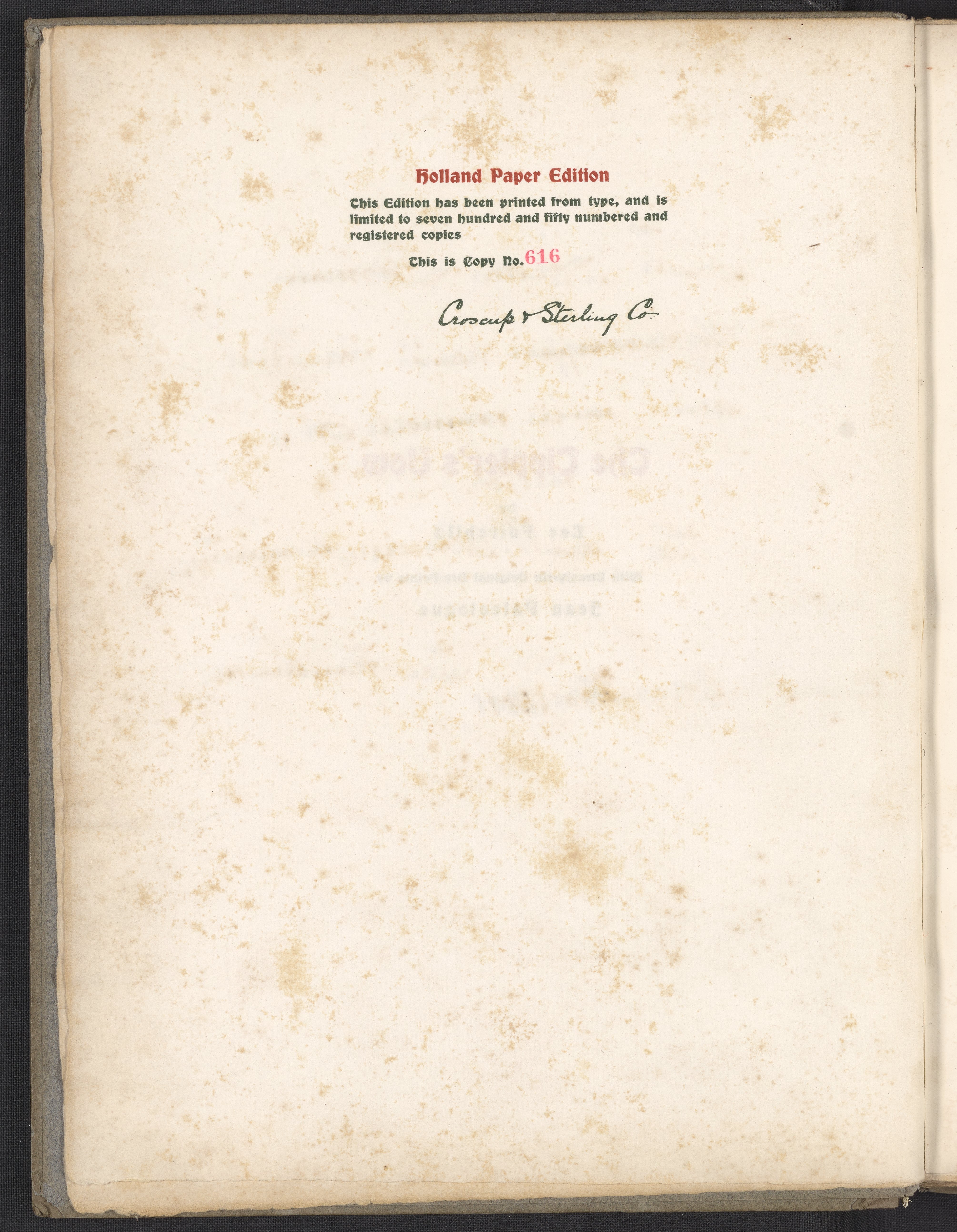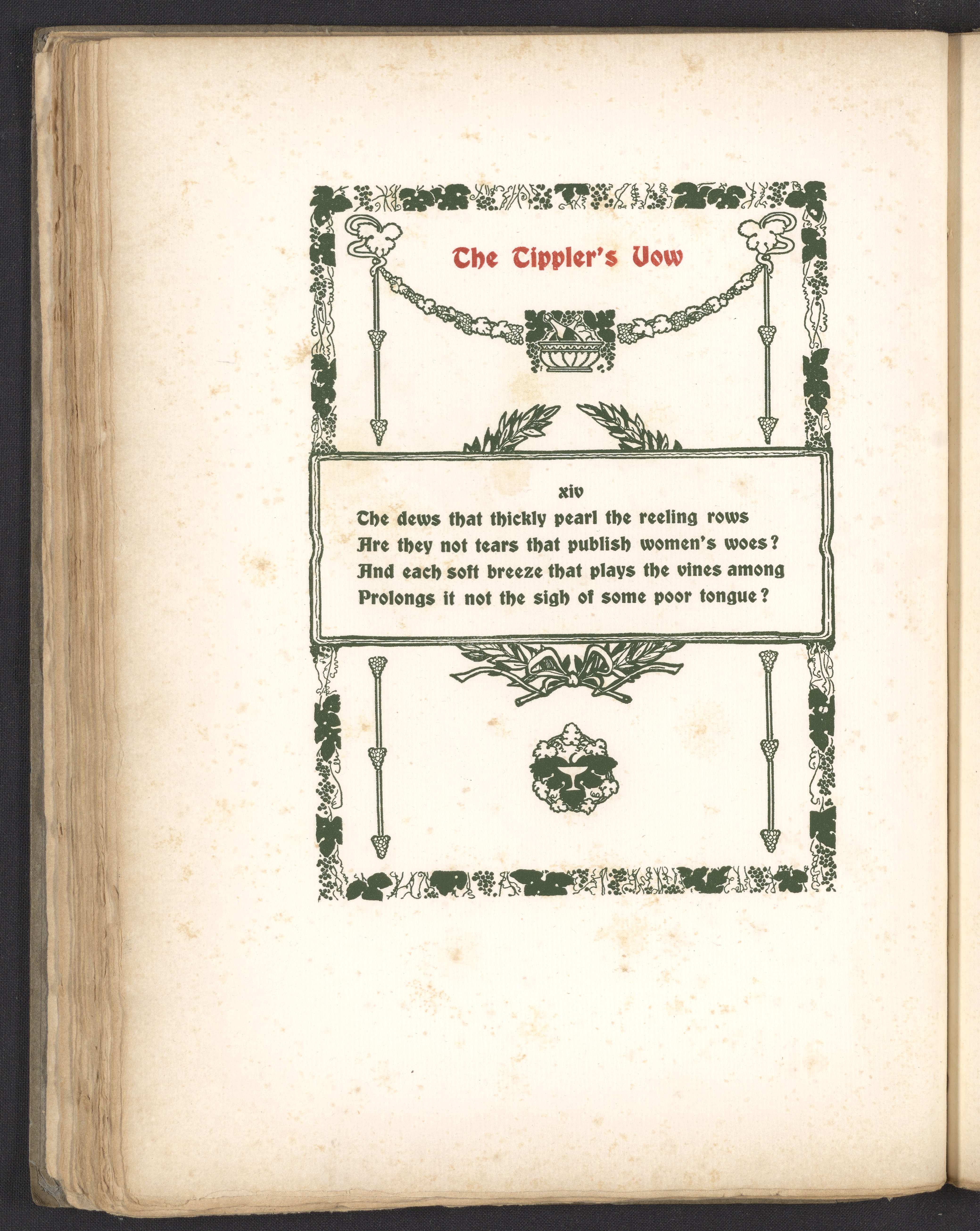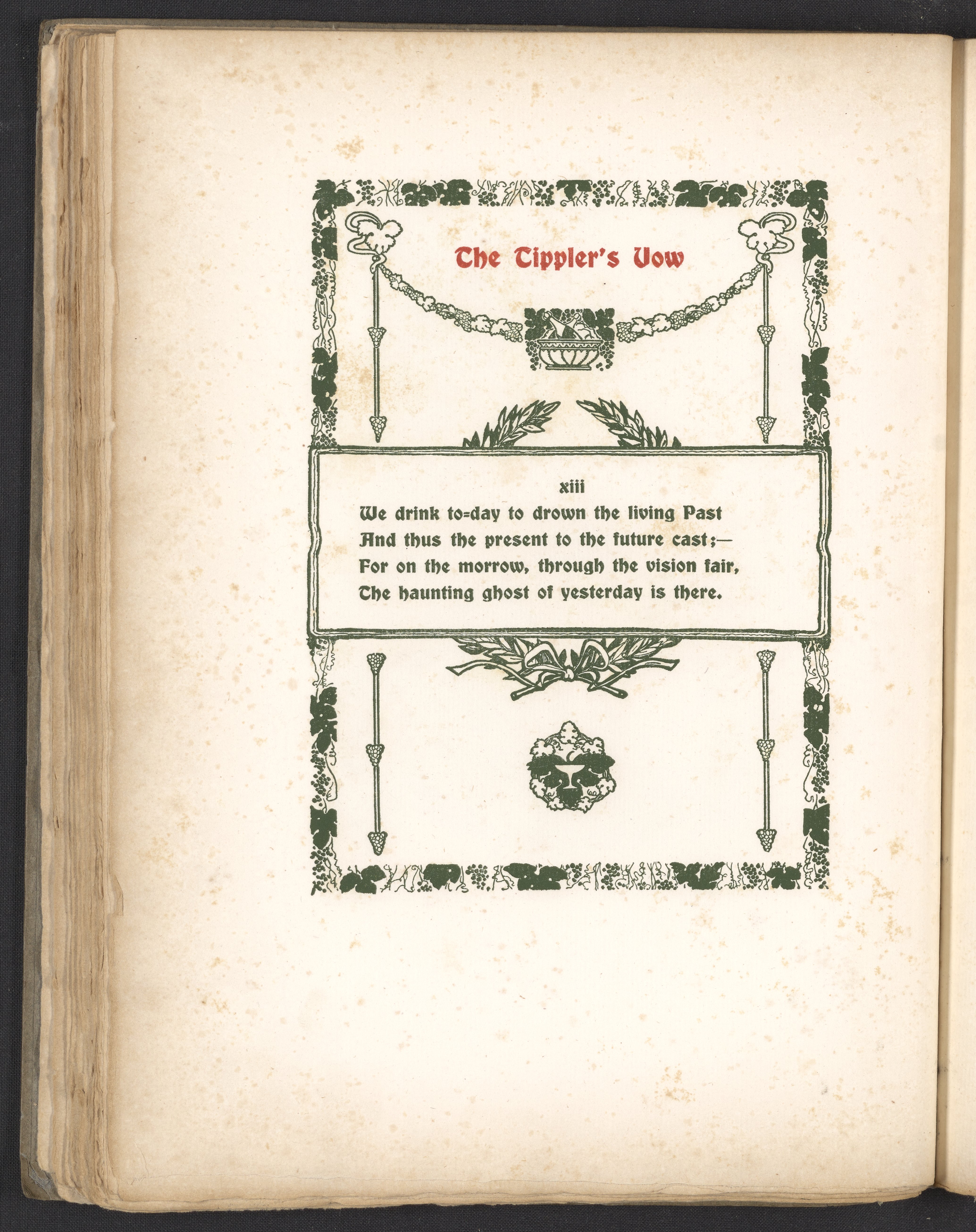 Small JPG1200 x 1554px — 347 KBLarge JPG2880 x 3729px — 2.4 MBFull-sized JPG4029 x 5217px — 4.5 MBOriginal fileTIFF — 4029 x 5217px — 60.2 MBVolume containing a poem of 25 strophes by Lee Fairchild (1860-1910). The poem, written in the first-person point of view, is a promise to embrace temperance. It is printed first, continuously, then each verse is printed on a separate leaf with an illustration on the opposite page. Finally, the poem is reprinted as it was first published in February 1901 in 17 strophes. The edition was limited to 750 numbered copies and this particular volume is number 616 of 750. It is printed on Holland paper and includes 26 original drypoint etchings by Romanian artist Jean de Paleologue (1855-1942). Many of the leaves in this copy are unopened and its pages are uncut. The work's flyleaf includes an inscription from the author.