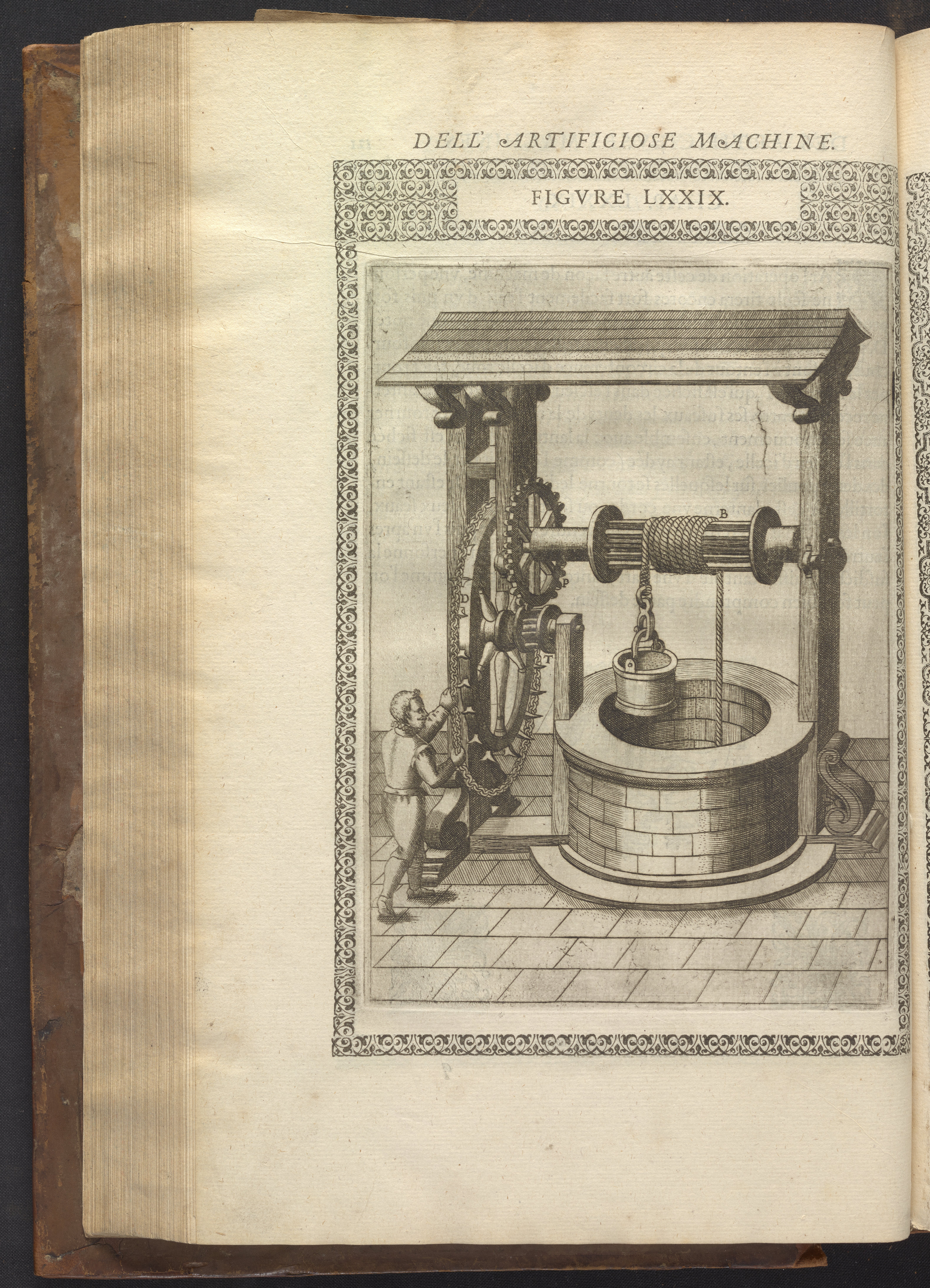 Ramelli, Agostino. “Plate 79: Single-Person-Operated Device for Drawing Water from a Very Deep Well.” In Le Diverse Et Artificiose Machine Del Capitano Agostino Ramelli. Paris, France, 1588. https://digital.sciencehistory.org/works/rr171x445.