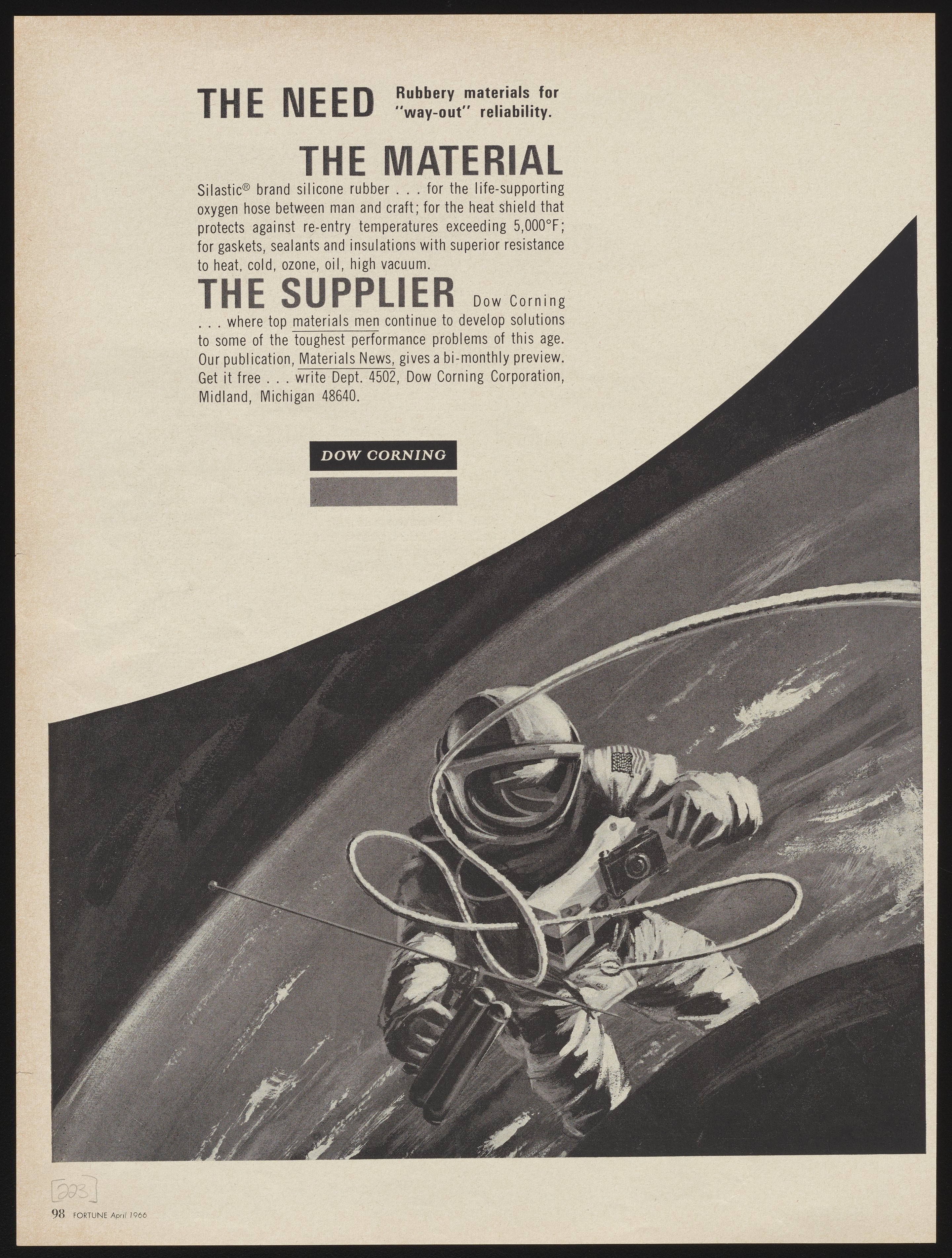 Black and white print advertisement for Silastic brand silicone rubber manufactured and sold by the Dow Corning Corporation. The advertisement depicts an American astronaut in space and details the use of silicone rubber in a variety of materials used to facilitate space exploration, including oxygen hoses, heat shields, gaskets, and sealants. This advertisement appeared on page 98 of the April 1966 edition of Fortune magazine.