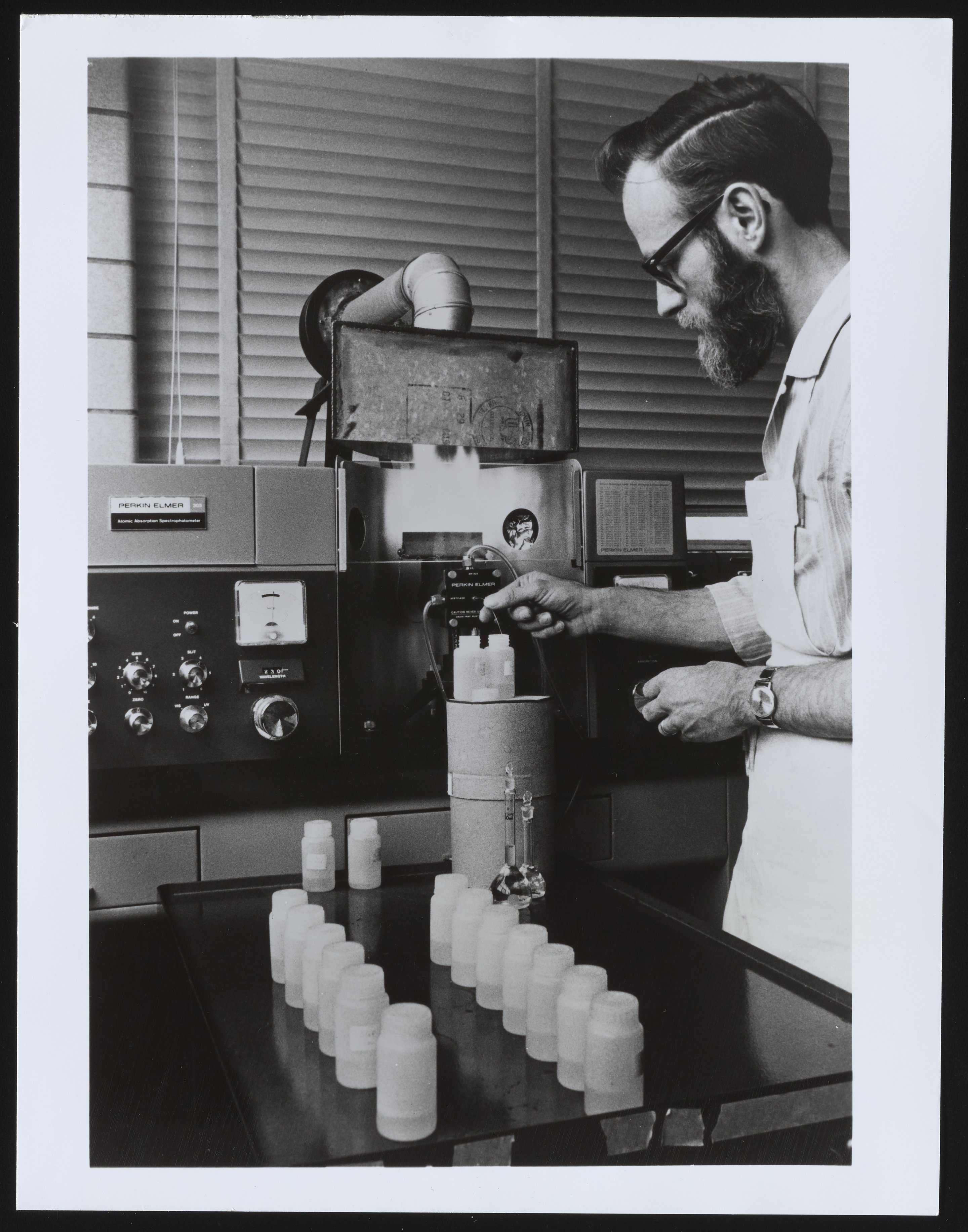 General view of laboratory technician Richard Thomson preparing water samples for testing at the New York City Bureau of Water Supply's Ben Nesin Laboratory. Per notations accompanying the photograph, a Perkin-Elmer Model 303 Atomic Absorption Spectrophotometer is used to determine the presence and measure the quantity of trace elements in the water.