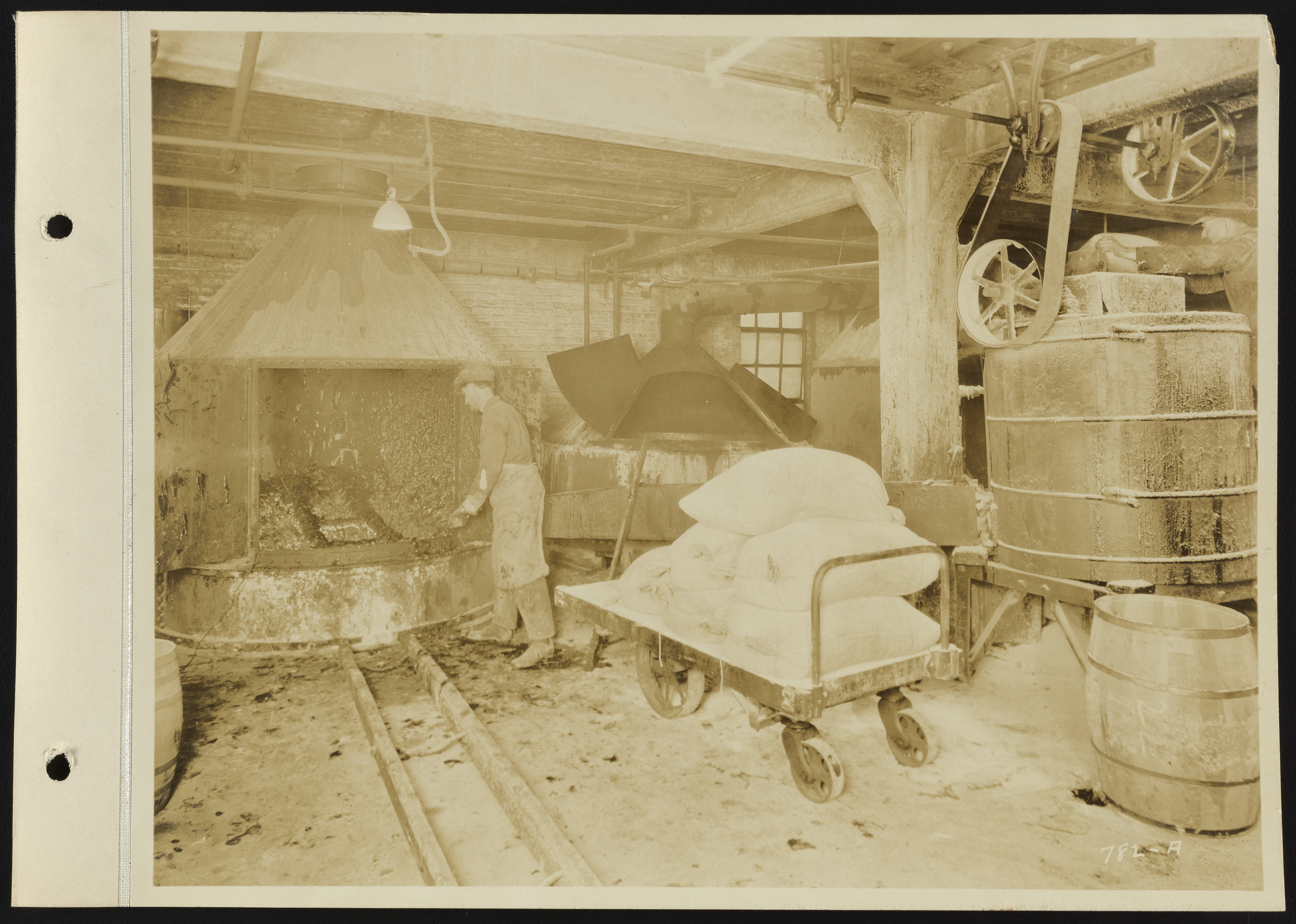 General view of an unidentified employee at work in the Dearborn Chemical Company's 35th Street laboratory facility and manufacturing plant. Founded in 1887, the Dearborn Chemical Company was a corporate ancestor of BetzDearborn, Incorporated best known for manufacturing water treatment chemicals for use in boilers and cooling towers.