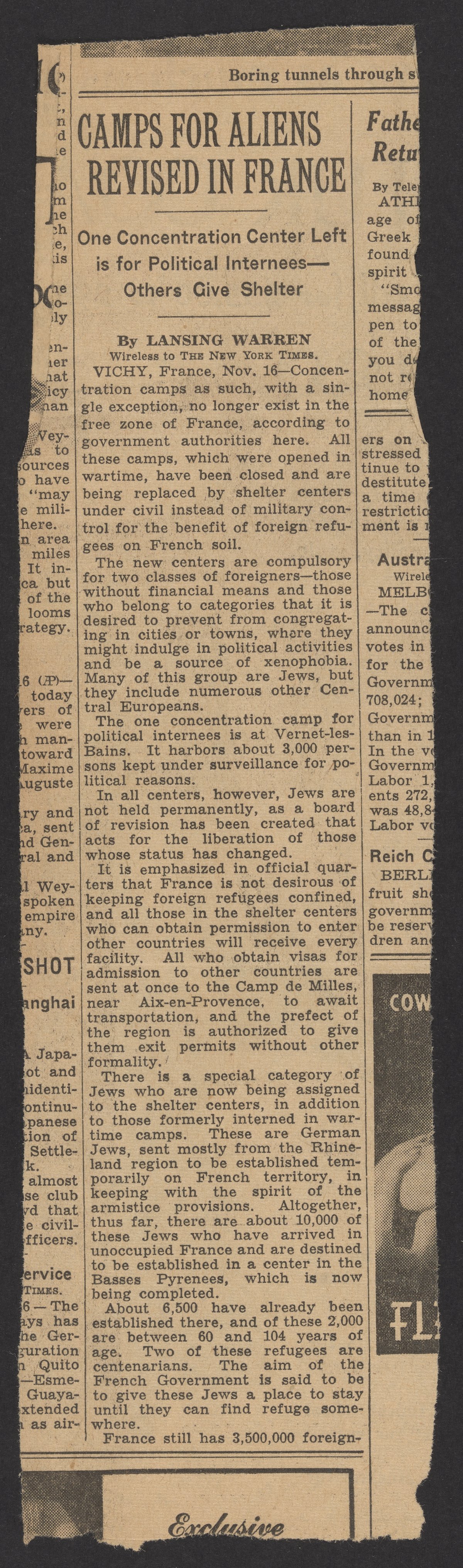 Warren, Lansing. “Camps for Aliens Revised in France; One Concentration Center Left Is for Political Internees - Others Give Shelter.” New York, New York: New York times, November 17, 1940. Papers of Max Bredig, Box 8, Folder 8. Science History Institute. Philadelphia. https://digital.sciencehistory.org/works/rsgimn4.