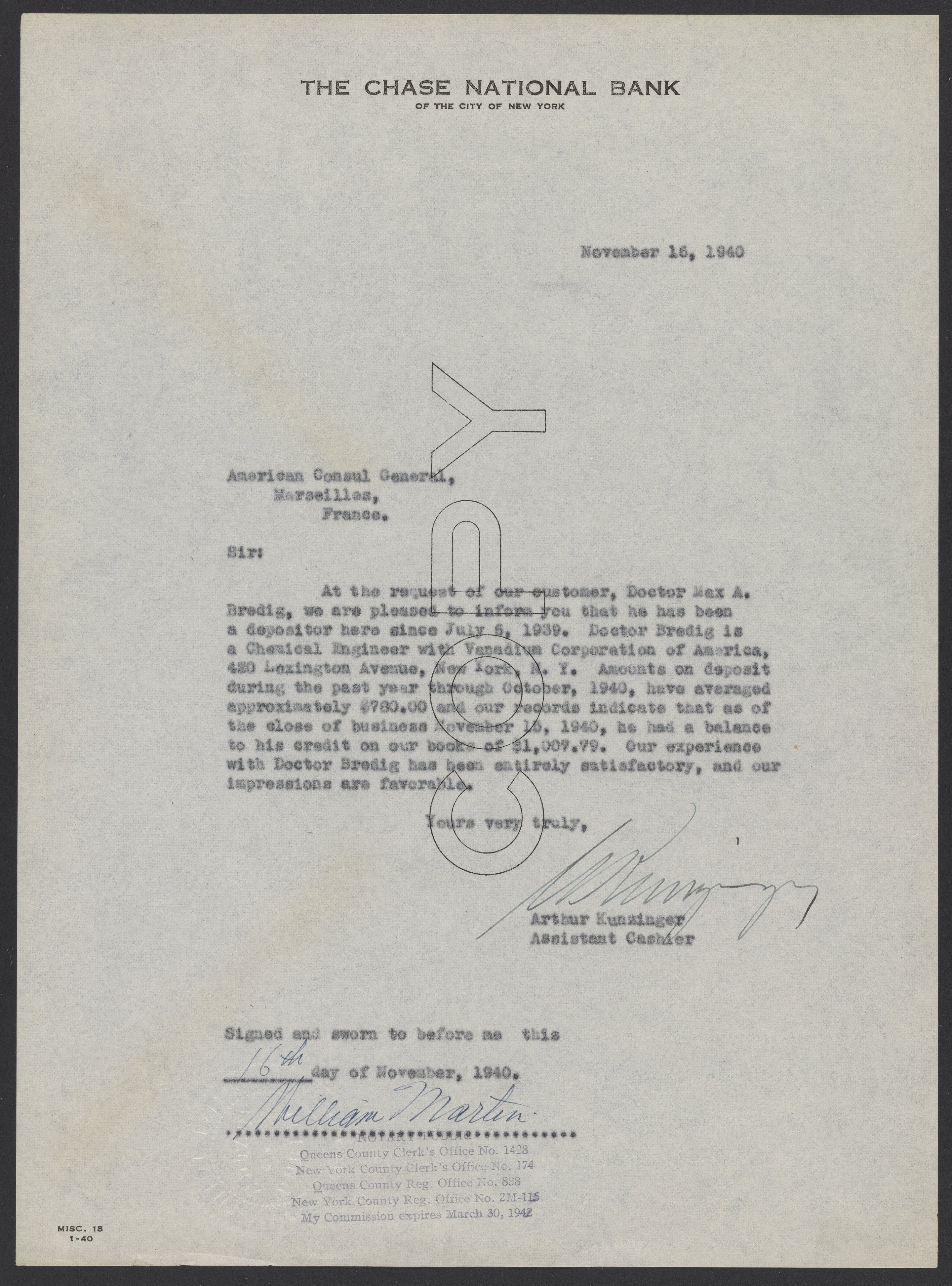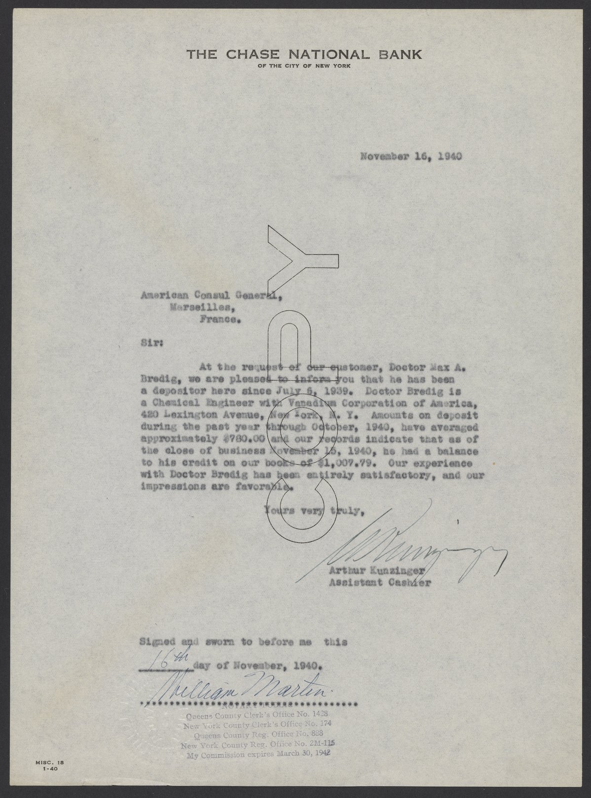 Copy of a letter from Arthur Kunzinger to the American Consul General in Marseilles, France on behalf of Max Bredig (1902-1977). The letter states that Bredig is an employee at Vanadium Corporation of America and provides details of his finances.