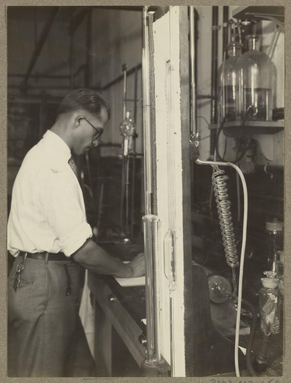 “Dr. Leatherman Measuring Traces of Inert Gas and Air in Nitrogen,” August 21, 1928. Travis P. Hignett Collection of Fixed Nitrogen Research Laboratory Photographs, Box 2. Science History Institute. Philadelphia. https://digital.sciencehistory.org/works/rv042t17h.