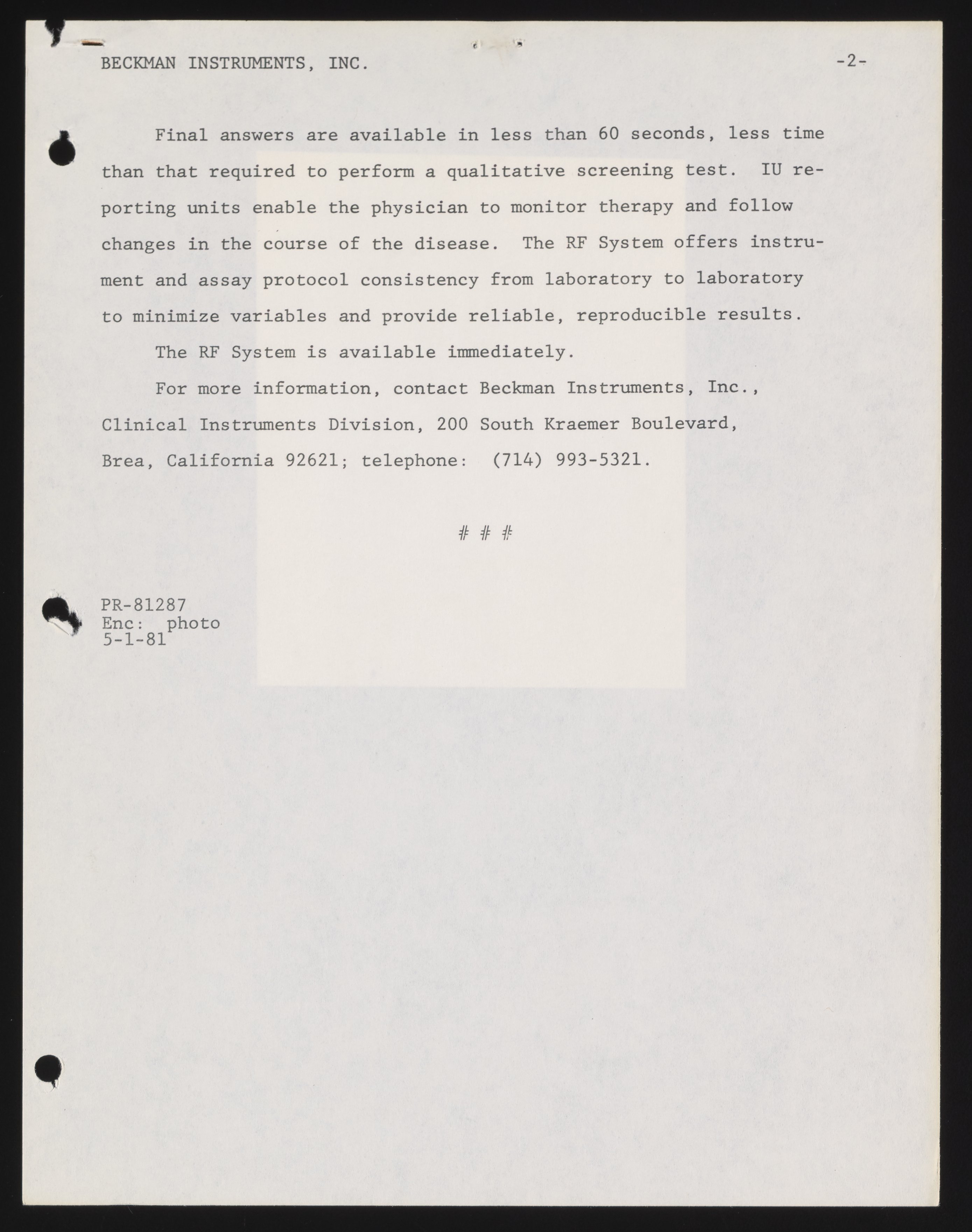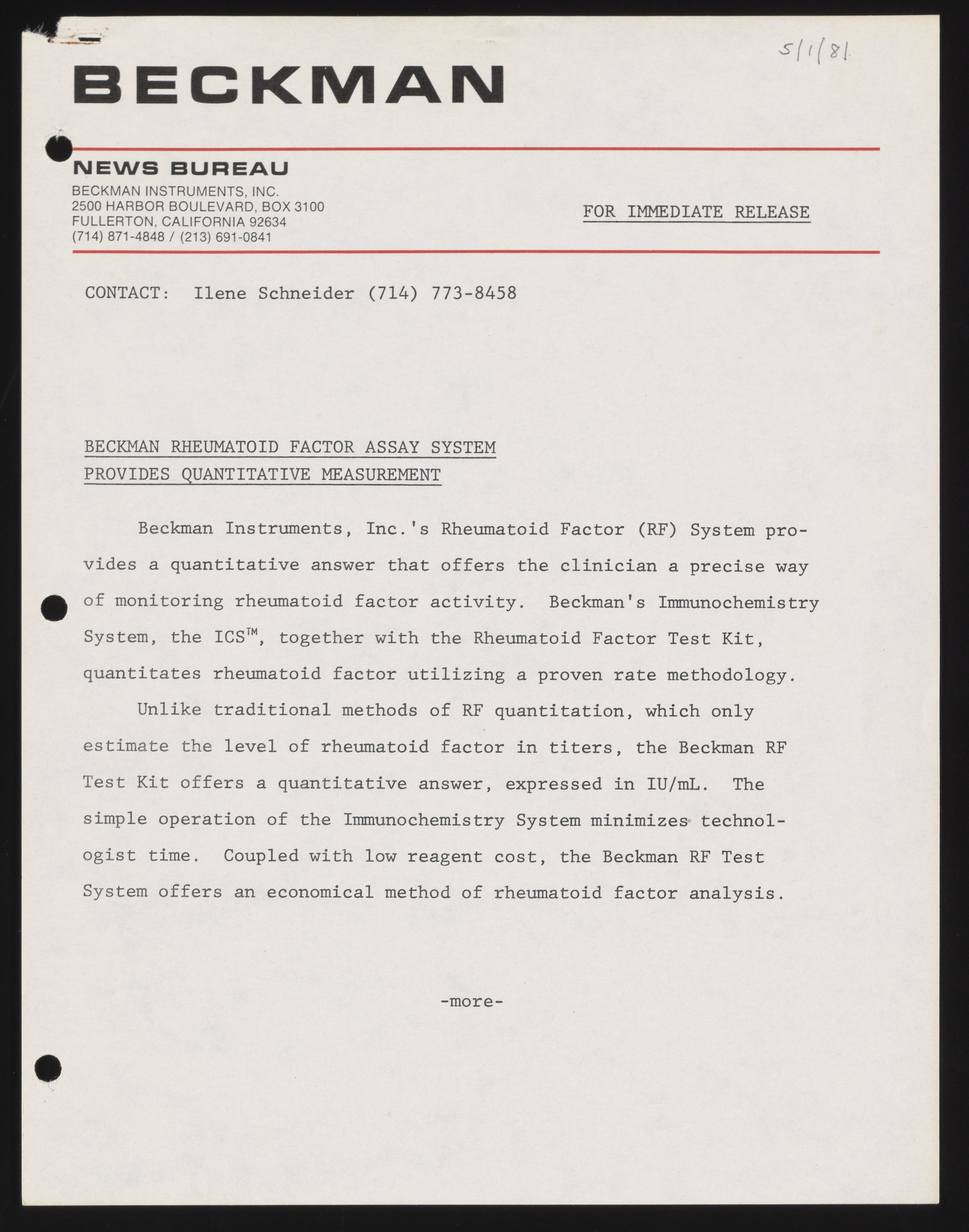 Beckman Rheumatoid Factor Assay System Provides Quantitative Measurement