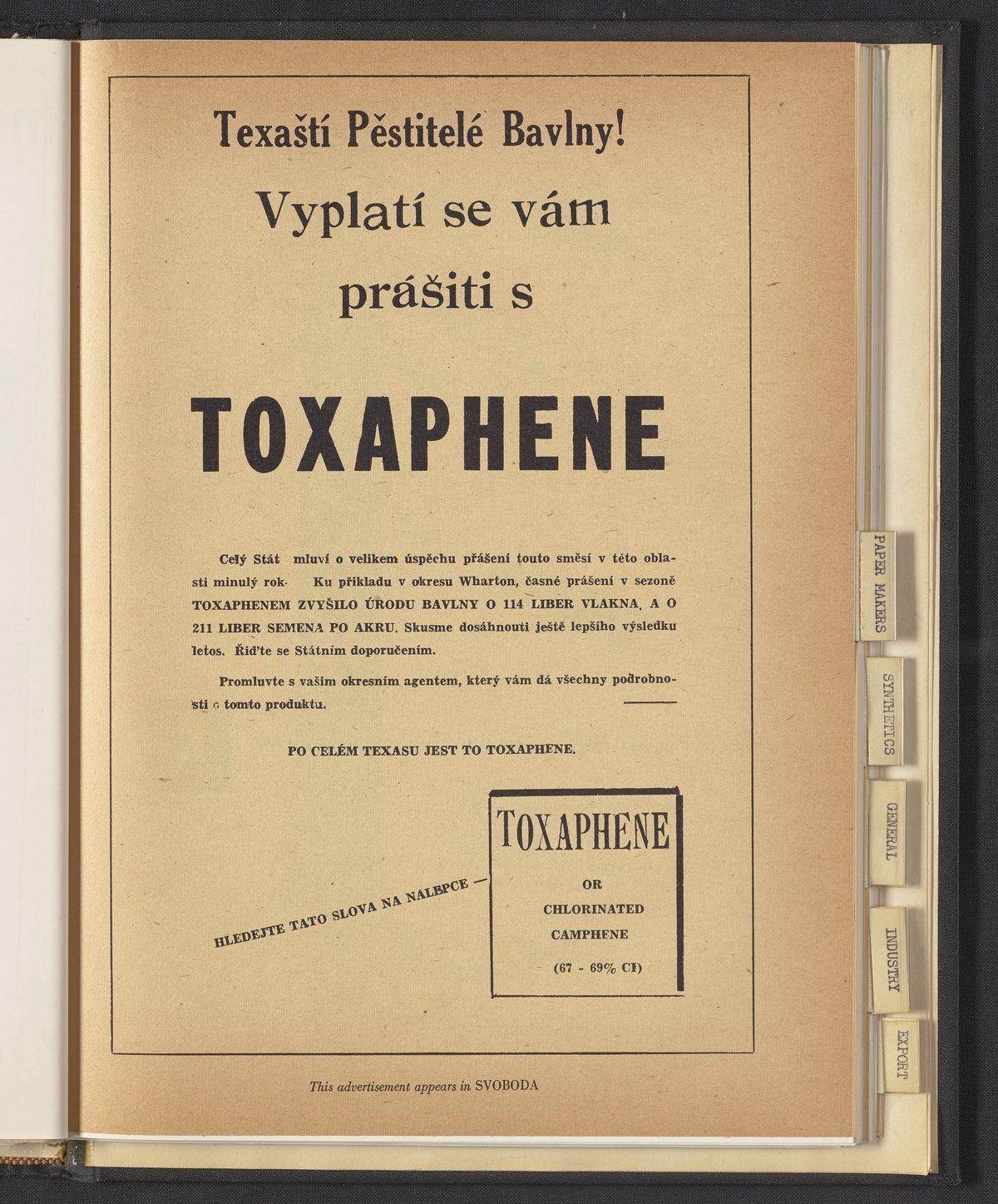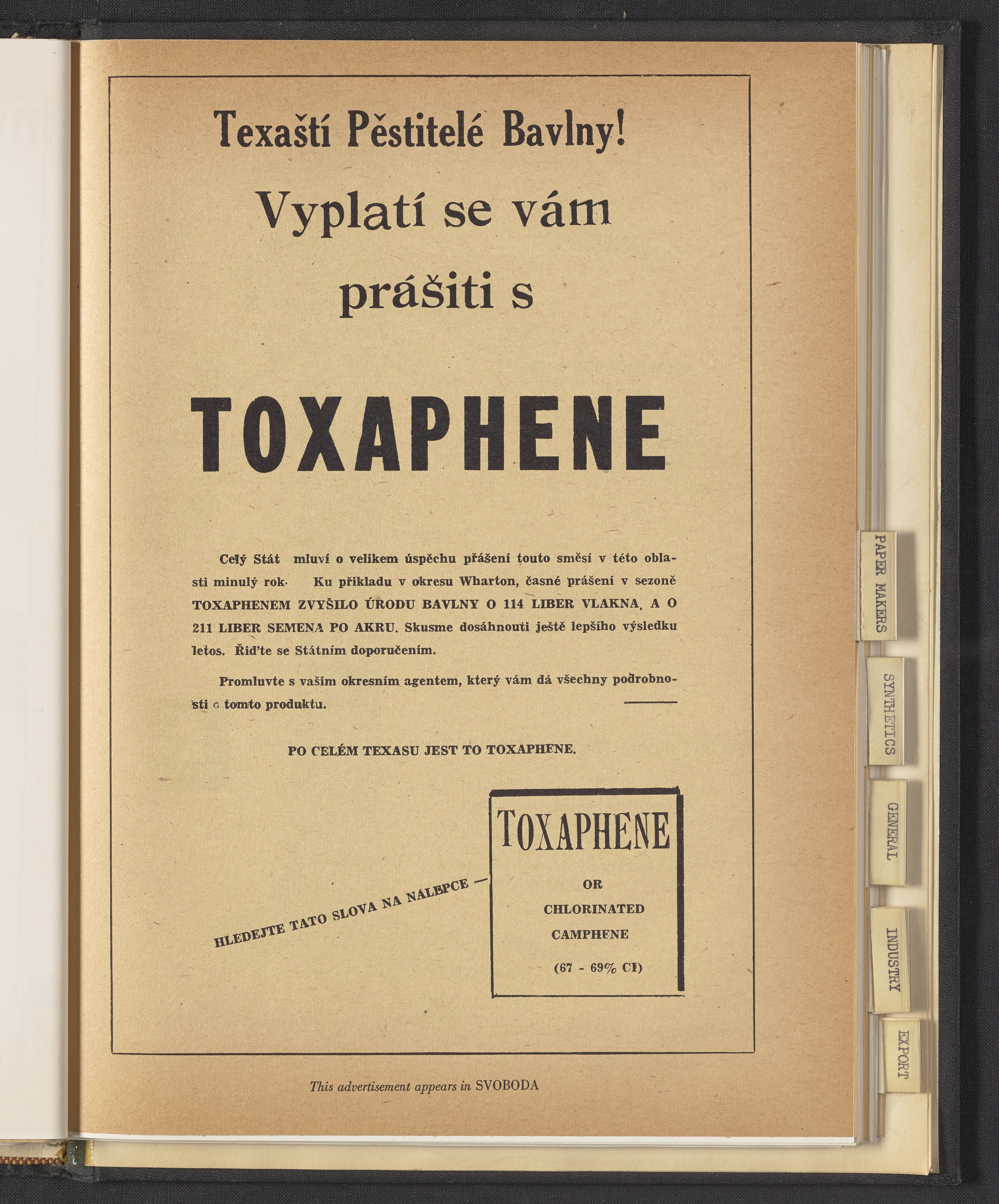 Hercules Incorporated. “Texaští Pěstitelě Bavlny! Vyplatí Se Vám Prášiti s Toxaphene.” 1949 Hercules Advertisements, 1949. Records of Hercules Incorporated, Volume 1949. Science History Institute. Philadelphia. https://digital.sciencehistory.org/works/rv042t744.