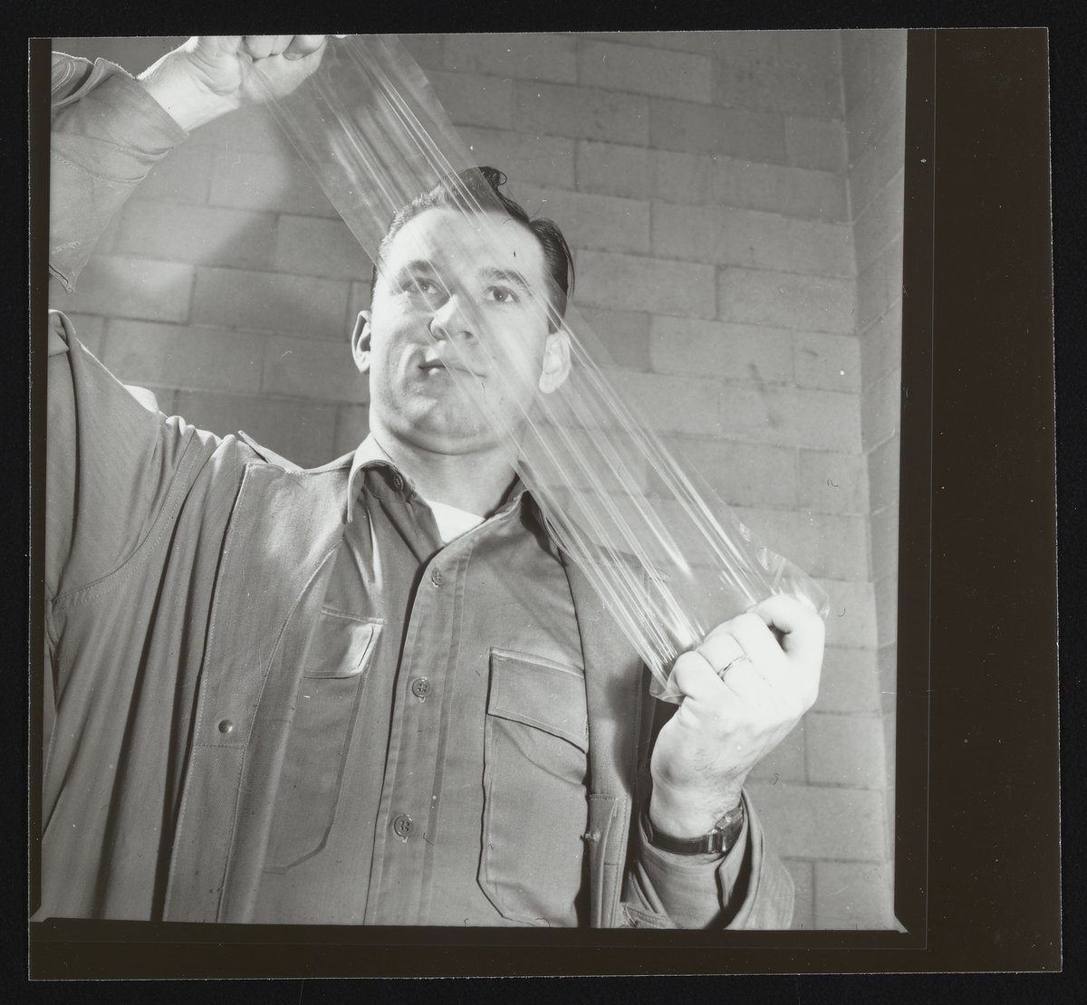 General view of an unidentified employee inspecting a piece of Saran Wrap at a Dow Chemical Company facility. Initially developed for the U.S. Army to wrap arms and equipment for transport during World War II, saran plastic was subsequently developed and marketed as Saran Wrap for household use.