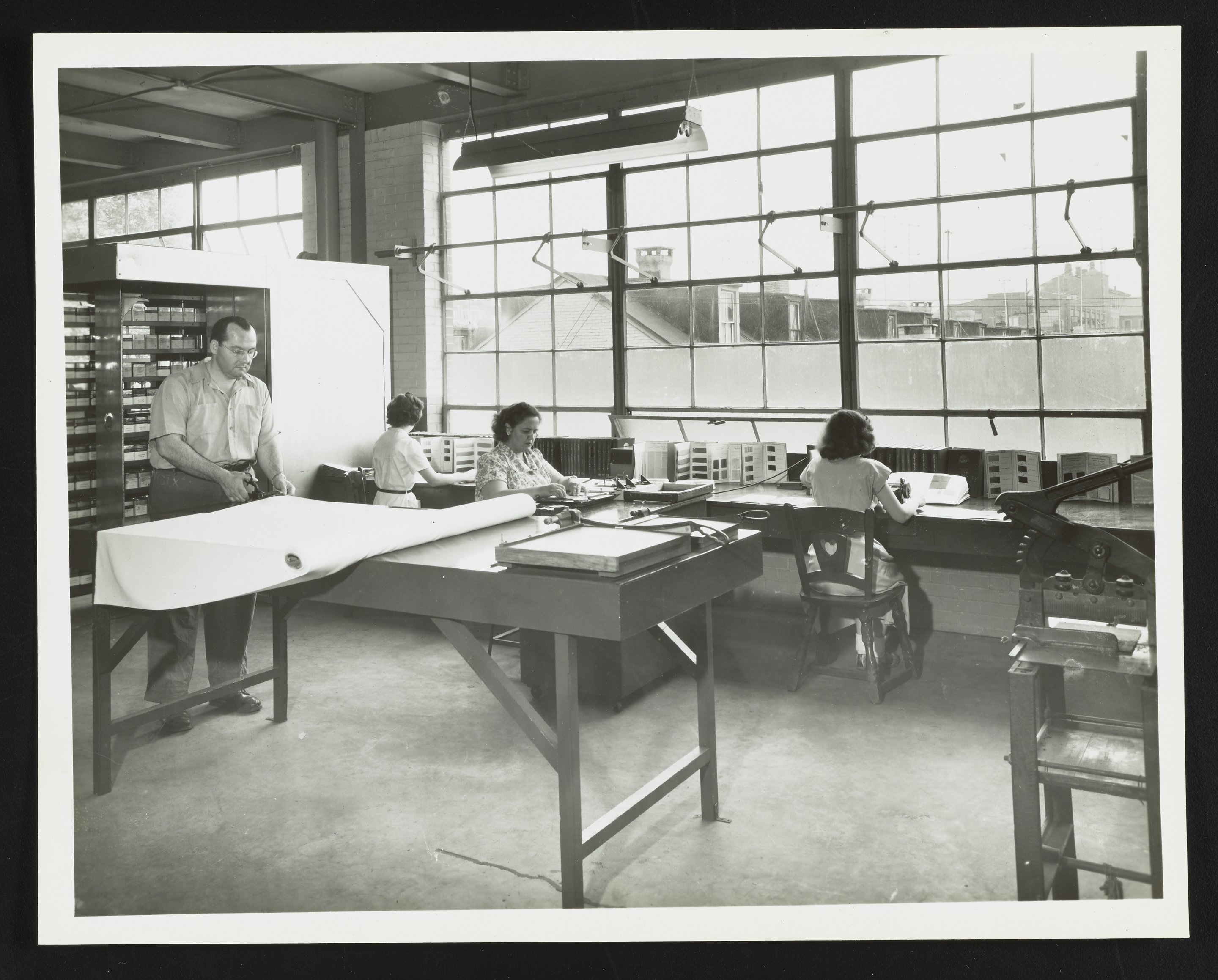 General view of the Printing Department at the Althouse Chemical Company Customer Service and Quality Control Laboratory in Reading, Pennsylvania. Omer Bixler (left) is seen cutting fabric samples while technicians near the right wall prepare sample books to illustrate dye properties for customers. Norma Bodey is the technician seated nearest the camera on the right-hand side.