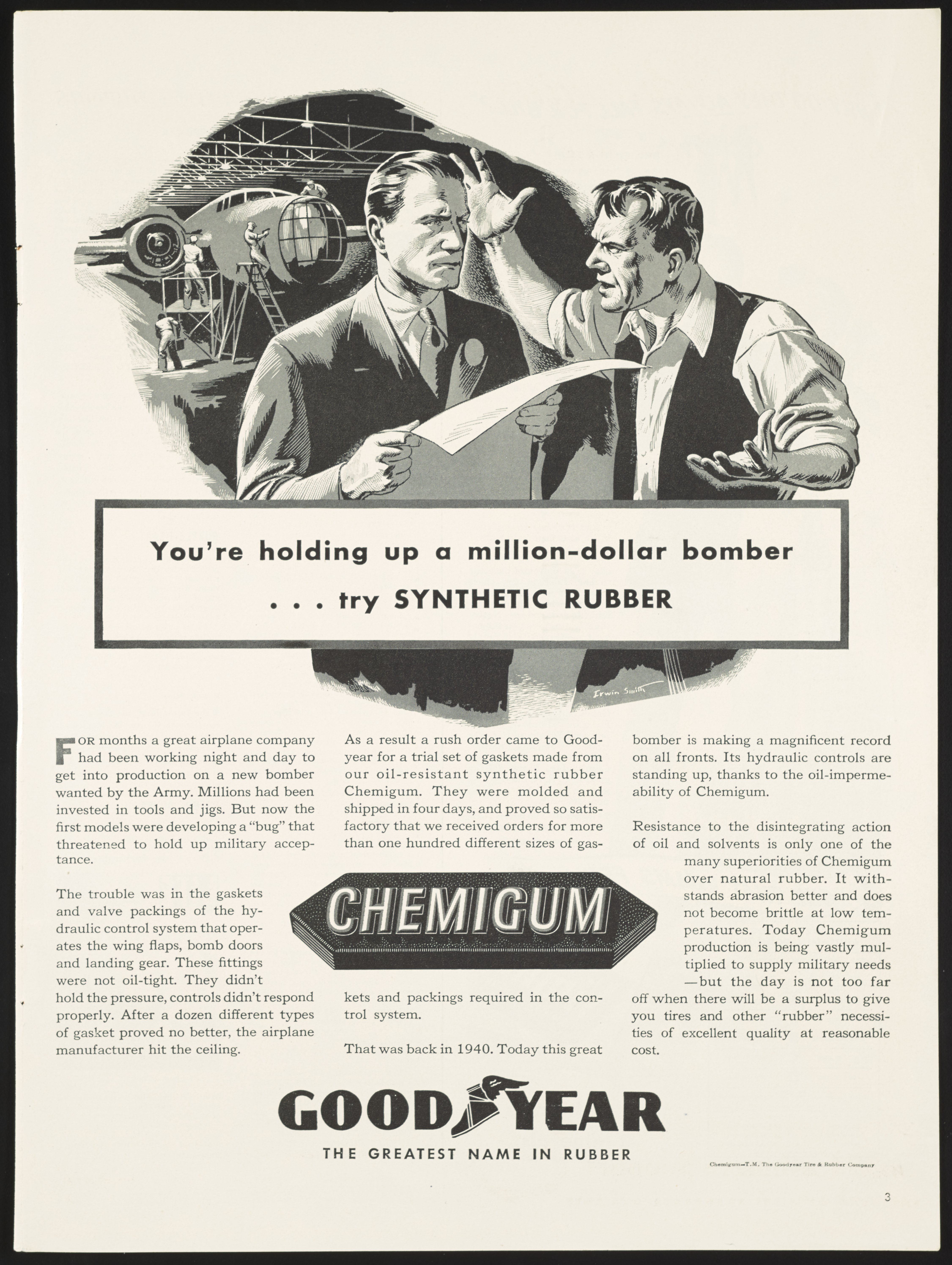 Smith, Irwin. “You'Re Holding up a Million-Dollar Bomber... Try SYNTHETIC RUBBER,” 1943. Science History Institute. Philadelphia. https://digital.sciencehistory.org/works/rx913q023.
