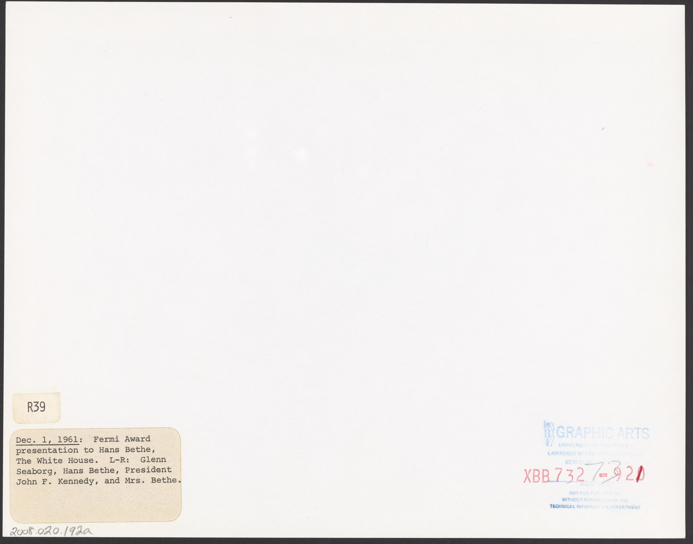 Small JPG1200 x 941px — 146 KBLarge JPG2880 x 2259px — 753 KBFull-sized JPG6844 x 5368px — 4.0 MBOriginal fileTIFF — 6844 x 5368px — 105 MBBlack and white photograph depicting the Erico Fermi Award presentation to Hans Bethe (1906-2005) at the White House. Bethe was a German-American theoretical physicist who contributed to the fields of nuclear physics, astrophysics, quantum electrodynamics, and solid-state physics. Pictured left to right are Glenn Seaborg (1912-1999), Dr. Bethe, President John F. Kennedy (1917-1963), and Rose Ewald (1939-2005).