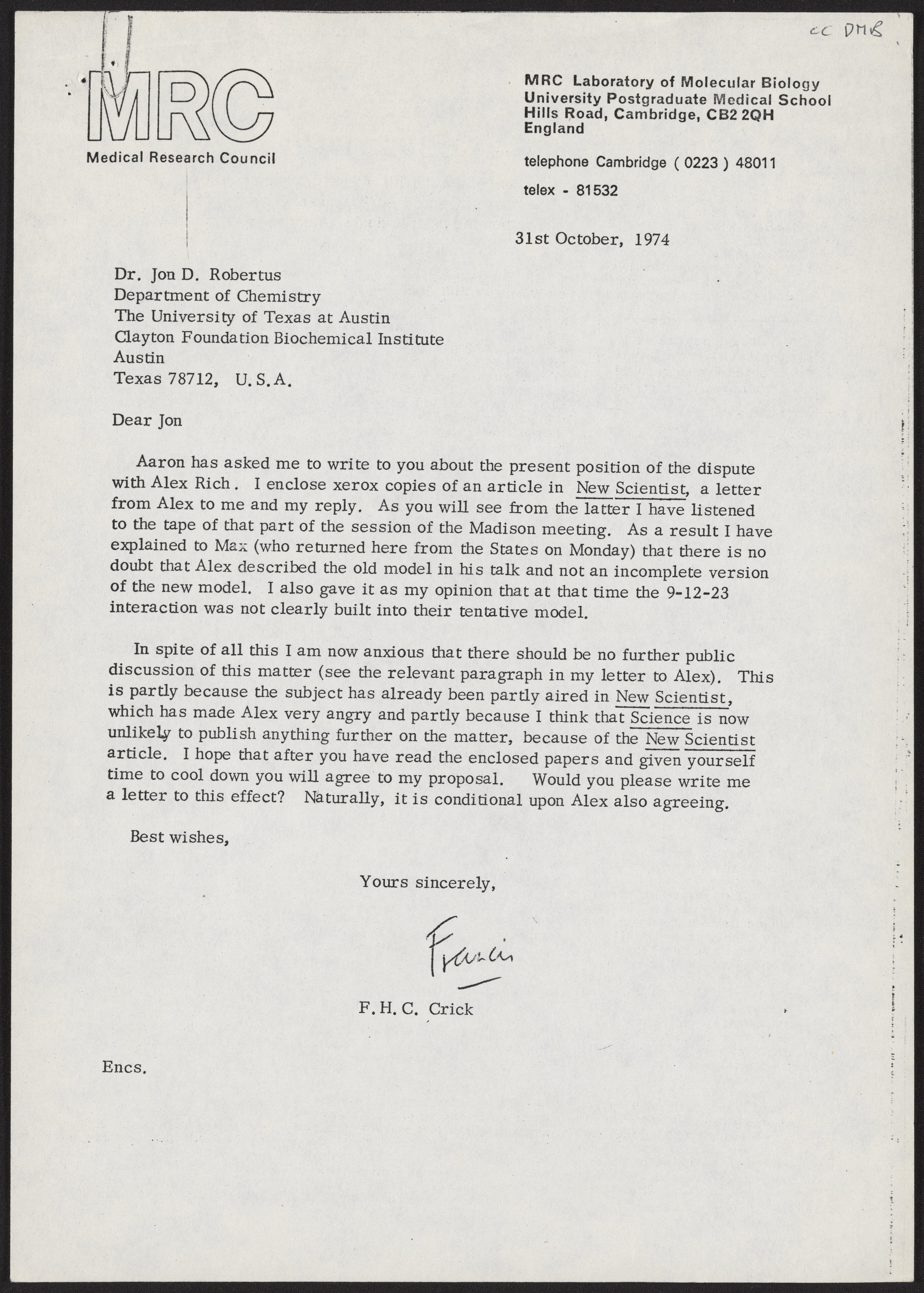 Letter from Francis Crick to Jon D. Robertus, October 31, 1974