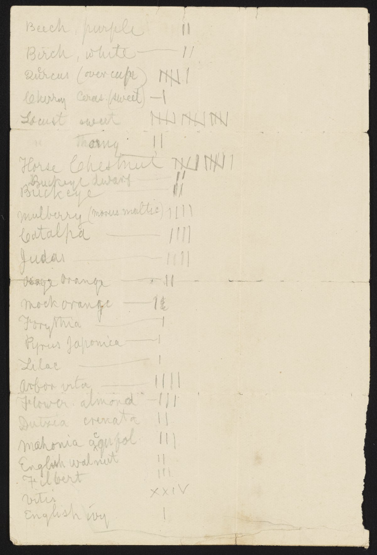 Handwritten list of trees