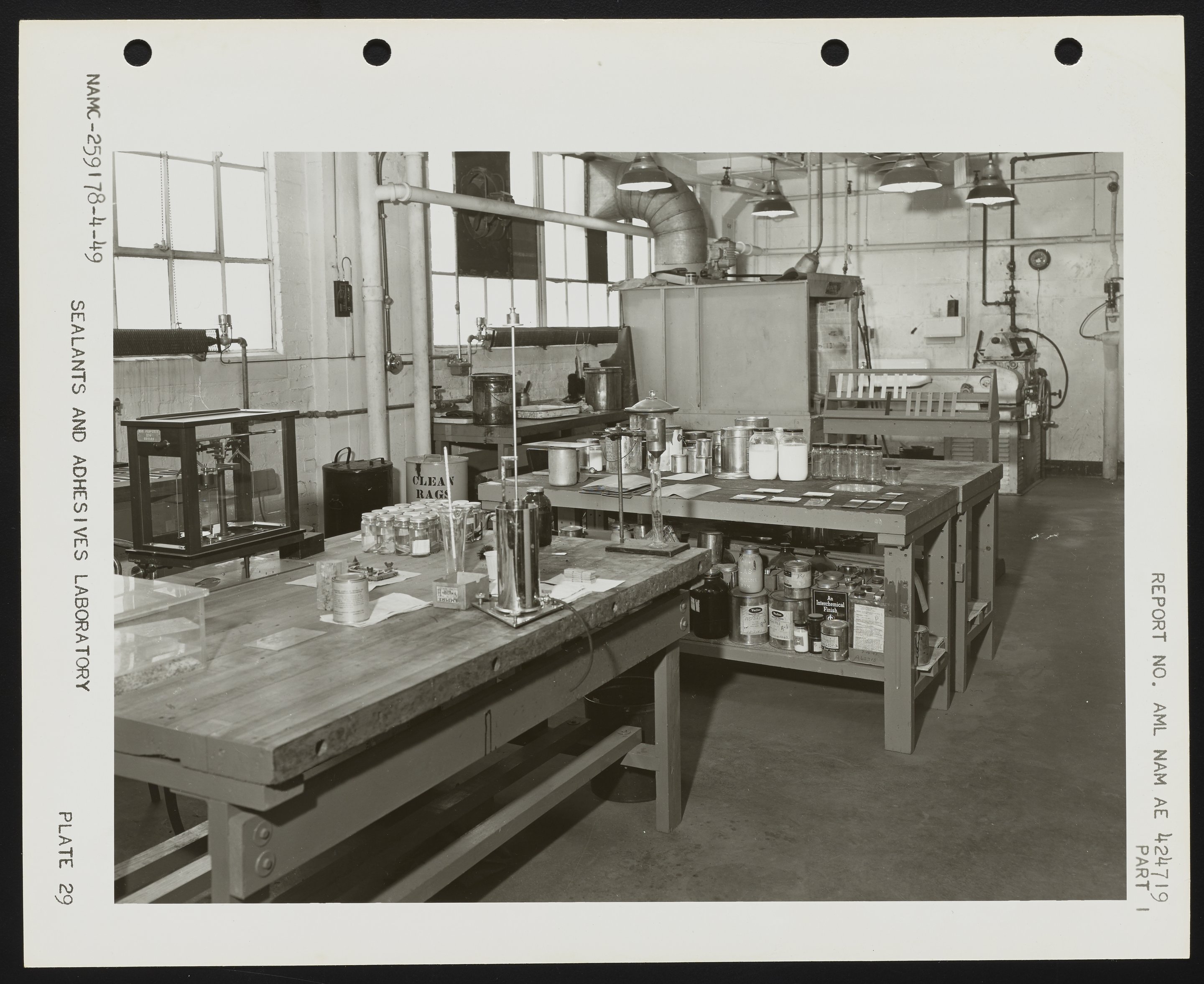 General view of the Sealants and Adhesives Laboratory at the Naval Air Experimental Station showing assorted samples of viscous materials and equipment used to manufacture and test sealants and adhesives of both rubber and non-rubber bases. The laboratory was equipped with an explosion-proof lighting system and motors. This photograph was included in a 1949 Naval Air Experimental Station report on compounding rubber.