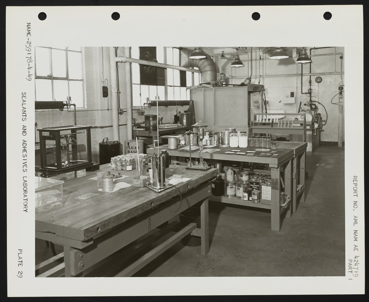 Naval Air Experimental Station, and United States. Navy. “Sealants and Adhesives Laboratory at the Naval Air Experimental Station,” circa 1949. Photographs from the Papers of J. Hartley Bowen, Box 1. Science History Institute. Philadelphia. https://digital.sciencehistory.org/works/s1784k77h.