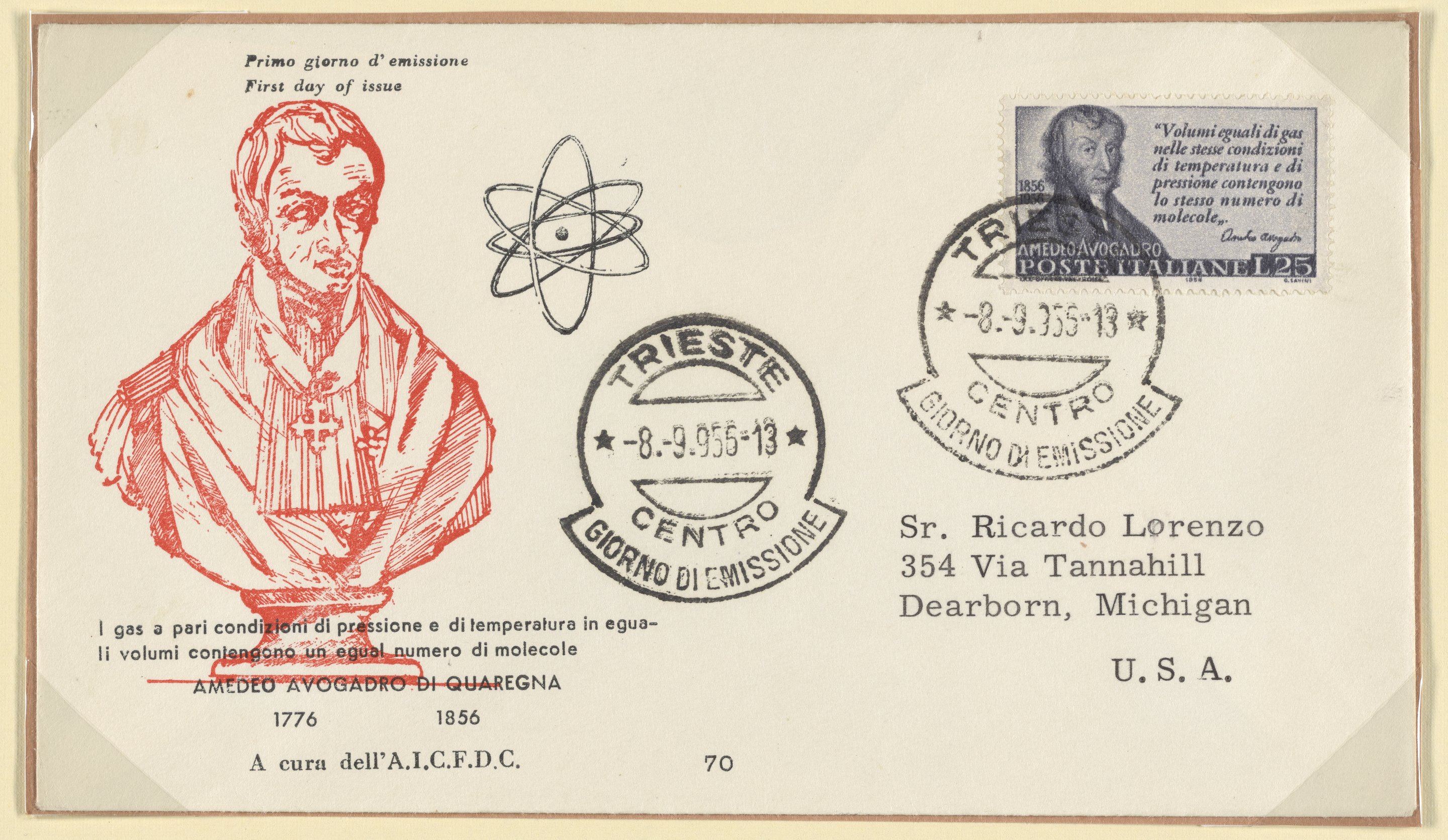 First Day Cover commemorating the centenary of the death of Amedeo Avogadro