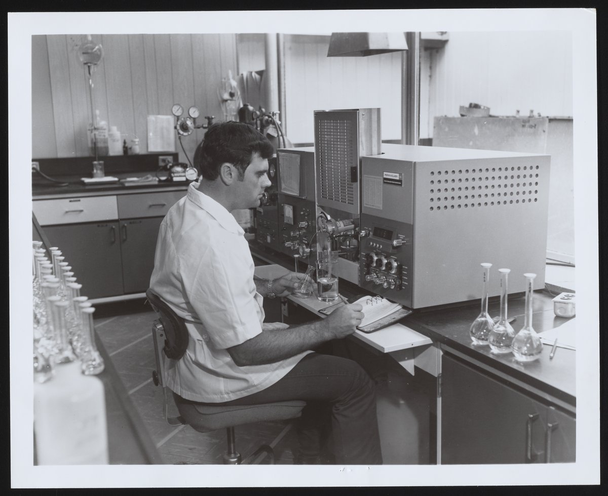 General view of assistant chemist Lawrence Koerber using a Perkin-Elmer Model 403 Atomic Absorption Spectrophotometer to test an ash sample in a Peabody Coal Company laboratory. Per notations accompanying the photograph, the spectrophotometer employs a flame mode of operation to examine samples of coal and ash, part of the company's ecological, environmental, and exploration programs.