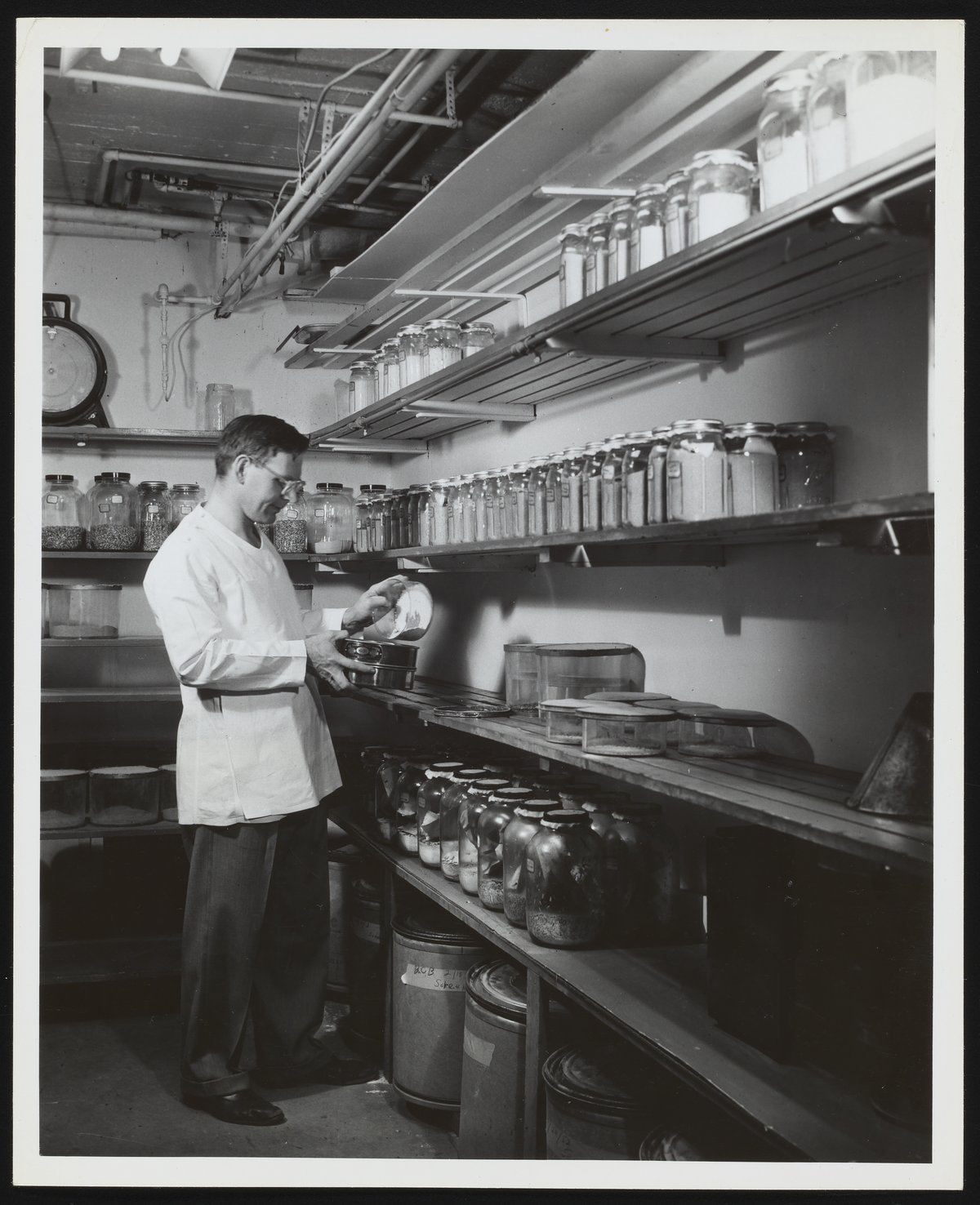 General view of entomologist E.E. ("Gene") Kenaga at work in the storage room for grain insect cultures at the Dow Chemical Company's Agricultural Chemical Research and Development Laboratory. Per notations accompanying the photograph, Kenaga is seen screening flour to remove insect larvae and transfer to a new culture as part of the laboratory's work to study the diseases of living plants and the effects of parasites.