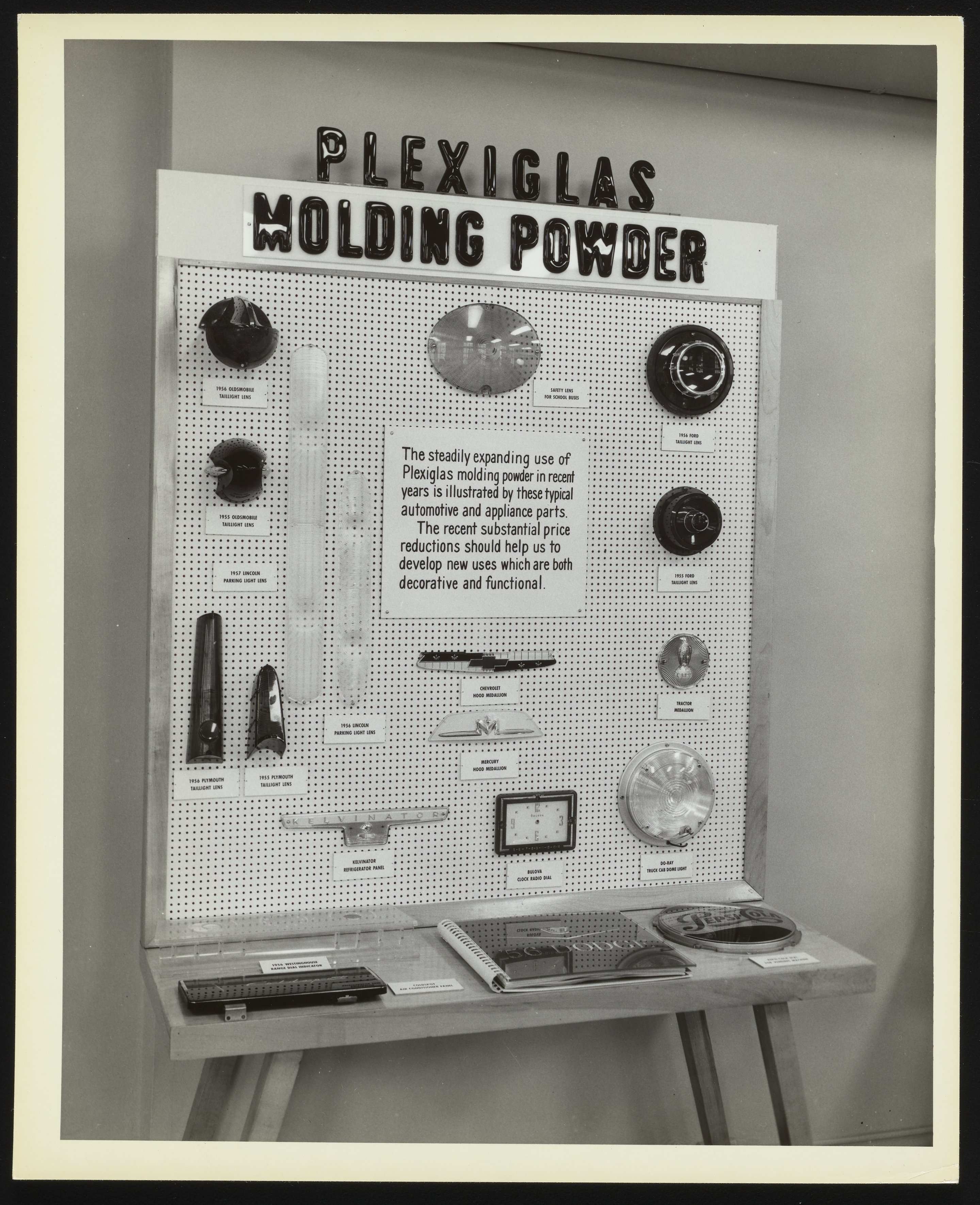 General view of a display board featuring assorted samples of automotive and appliance parts made with Plexiglas molding powder, including taillight lens, dome lights, and hood medallions.